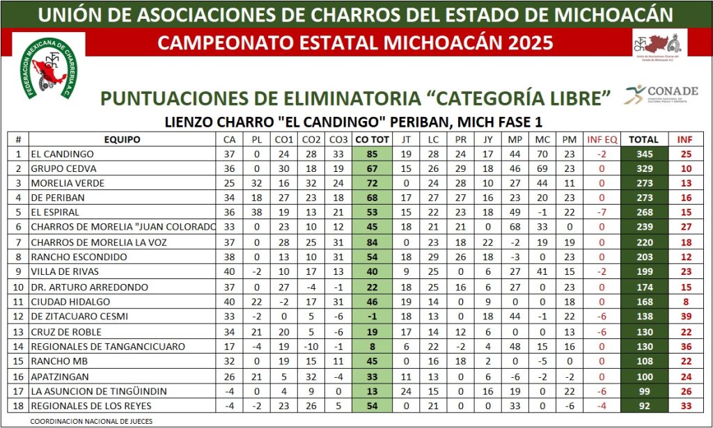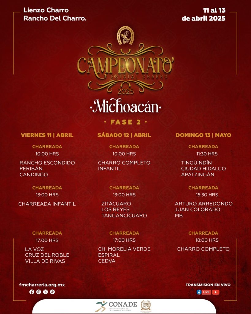 <!-- wp:separator --> <hr class="wp-block-separator has-alpha-channel-opacity"/> <!-- /wp:separator --> <!-- wp:heading {"textAlign":"center"} --> <h2 class="wp-block-heading has-text-align-center"><strong>Resultados<br>Equipos</strong></h2> <!-- /wp:heading --> <!-- wp:paragraph {"align":"center"} --> <p class="has-text-align-center"><strong>Promedios</strong></p> <!-- /wp:paragraph --> <!-- wp:image {"id":26689,"width":"1027px","height":"auto","sizeSlug":"full","linkDestination":"none","align":"center"} --> <figure class="wp-block-image aligncenter size-full is-resized"><img src="https://fmcharreria.org.mx/wp-content/uploads/Michoacan-EST25-Equipos-Promedios.jpeg" alt="" class="wp-image-26689" style="width:1027px;height:auto"/></figure> <!-- /wp:image --> <!-- wp:paragraph {"align":"center"} --> <p class="has-text-align-center"><strong>Fase 2</strong></p> <!-- /wp:paragraph --> <!-- wp:image {"id":26688,"width":"1020px","height":"auto","sizeSlug":"full","linkDestination":"none","align":"center"} --> <figure class="wp-block-image aligncenter size-full is-resized"><img src="https://fmcharreria.org.mx/wp-content/uploads/Michoacan-EST25-Equipos-Fase-2.jpeg" alt="" class="wp-image-26688" style="width:1020px;height:auto"/></figure> <!-- /wp:image --> <!-- wp:paragraph {"align":"center"} --> <p class="has-text-align-center"><strong>Fase 1</strong></p> <!-- /wp:paragraph --> <!-- wp:image {"id":26503,"sizeSlug":"large","linkDestination":"none","align":"center"} --> <figure class="wp-block-image aligncenter size-large"><img src="https://fmcharreria.org.mx/wp-content/uploads/Resultados-Equipos-F1-Michoacan-2025-1024x615.jpeg" alt="" class="wp-image-26503"/></figure> <!-- /wp:image --> <!-- wp:separator --> <hr class="wp-block-separator has-alpha-channel-opacity"/> <!-- /wp:separator --> <!-- wp:image {"id":26609,"sizeSlug":"large","linkDestination":"none","align":"center"} --> <figure class="wp-block-image aligncenter size-large"><img src="https://fmcharreria.org.mx/wp-content/uploads/Michoacan-EST25-Programa-F2-819x1024.jpg" alt="" class="wp-image-26609"/></figure> <!-- /wp:image -->