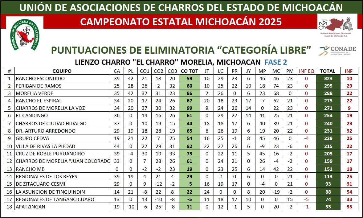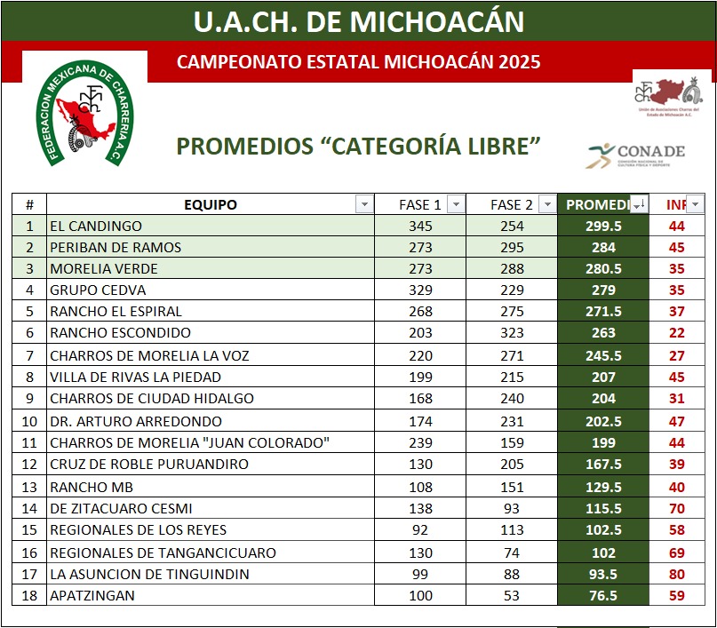 <!-- wp:separator --> <hr class="wp-block-separator has-alpha-channel-opacity"/> <!-- /wp:separator --> <!-- wp:heading {"textAlign":"center"} --> <h2 class="wp-block-heading has-text-align-center"><strong>Resultados<br>Equipos</strong></h2> <!-- /wp:heading --> <!-- wp:paragraph {"align":"center"} --> <p class="has-text-align-center"><strong>Promedios</strong></p> <!-- /wp:paragraph --> <!-- wp:image {"id":26689,"width":"1027px","height":"auto","sizeSlug":"full","linkDestination":"none","align":"center"} --> <figure class="wp-block-image aligncenter size-full is-resized"><img src="https://fmcharreria.org.mx/wp-content/uploads/Michoacan-EST25-Equipos-Promedios.jpeg" alt="" class="wp-image-26689" style="width:1027px;height:auto"/></figure> <!-- /wp:image --> <!-- wp:paragraph {"align":"center"} --> <p class="has-text-align-center"><strong>Fase 2</strong></p> <!-- /wp:paragraph --> <!-- wp:image {"id":26688,"width":"1020px","height":"auto","sizeSlug":"full","linkDestination":"none","align":"center"} --> <figure class="wp-block-image aligncenter size-full is-resized"><img src="https://fmcharreria.org.mx/wp-content/uploads/Michoacan-EST25-Equipos-Fase-2.jpeg" alt="" class="wp-image-26688" style="width:1020px;height:auto"/></figure> <!-- /wp:image --> <!-- wp:paragraph {"align":"center"} --> <p class="has-text-align-center"><strong>Fase 1</strong></p> <!-- /wp:paragraph --> <!-- wp:image {"id":26503,"sizeSlug":"large","linkDestination":"none","align":"center"} --> <figure class="wp-block-image aligncenter size-large"><img src="https://fmcharreria.org.mx/wp-content/uploads/Resultados-Equipos-F1-Michoacan-2025-1024x615.jpeg" alt="" class="wp-image-26503"/></figure> <!-- /wp:image --> <!-- wp:separator --> <hr class="wp-block-separator has-alpha-channel-opacity"/> <!-- /wp:separator --> <!-- wp:image {"id":26609,"sizeSlug":"large","linkDestination":"none","align":"center"} --> <figure class="wp-block-image aligncenter size-large"><img src="https://fmcharreria.org.mx/wp-content/uploads/Michoacan-EST25-Programa-F2-819x1024.jpg" alt="" class="wp-image-26609"/></figure> <!-- /wp:image -->