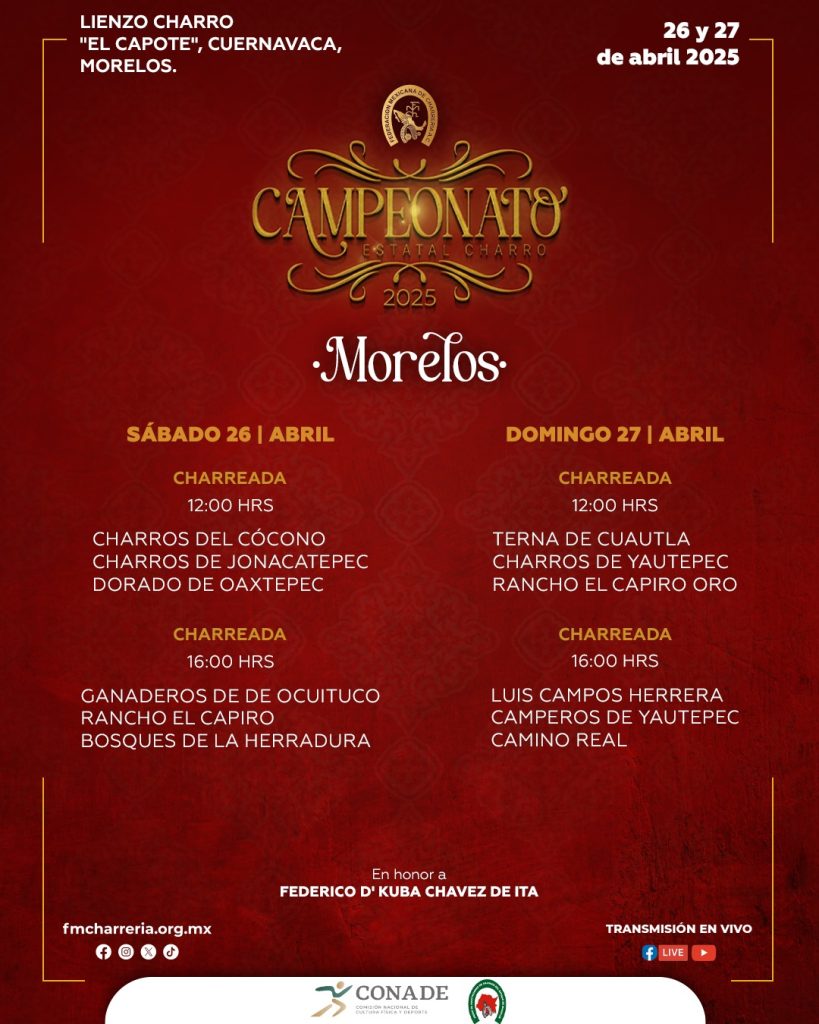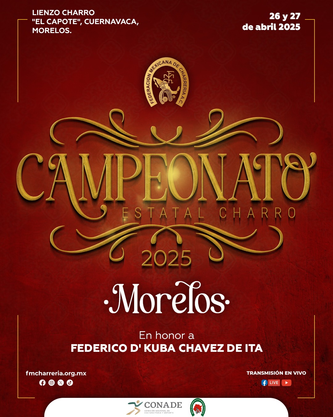 <!-- wp:separator --> <hr class="wp-block-separator has-alpha-channel-opacity"/> <!-- /wp:separator --> <!-- wp:image {"id":26699,"width":"819px","height":"auto","sizeSlug":"large","linkDestination":"none","align":"center"} --> <figure class="wp-block-image aligncenter size-large is-resized"><img src="https://fmcharreria.org.mx/wp-content/uploads/Morelos-EST25-Programa-819x1024.jpeg" alt="" class="wp-image-26699" style="width:819px;height:auto"/></figure> <!-- /wp:image --> <!-- wp:separator --> <hr class="wp-block-separator has-alpha-channel-opacity"/> <!-- /wp:separator -->
