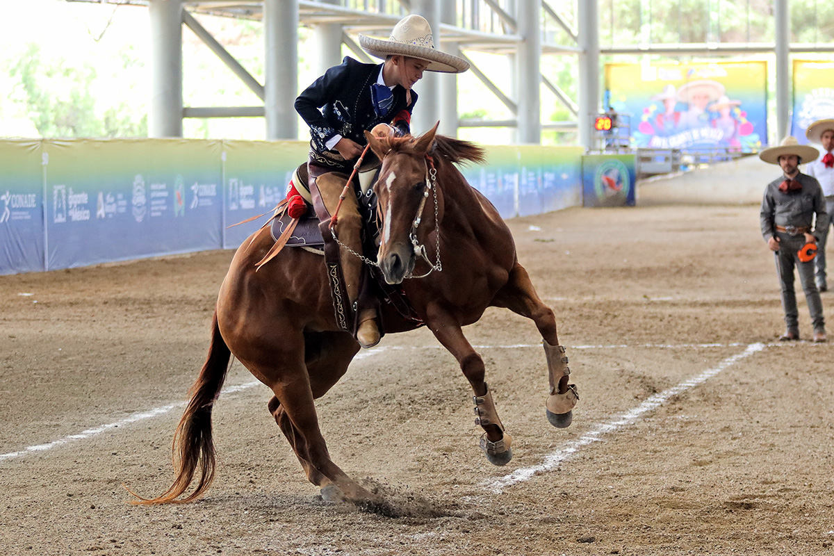La Escuela Nicolás Vázquez de Jalisco acumuló sus primeros 16 puntos de la cala de caballo de Santiago Fernando Curiel Langarica, sin piales, él mismo coleó para seis buenos; ejecutó una excelsa monta de toro de 25 de Mateo Alberto Ruiz Rios, lazo cabecero de 18 de Salvador Alejandro Jiménez Ruiz y 16 más del pial de ruedo de César Rafael Moreno García, sin haber tenido tiempo ahorrado.
