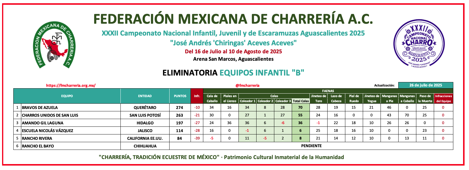 Los Bravos de Azuela de Querétaro se llevaron el primer duelo de la eliminatoria Infantil “A” con 274 puntos, siendo 34 de Juan Luis Gómez Oviedo en su cala de caballo, un pial de 16 de Jorge Daniel Fuentes Limón y colearon para 70, 34 de José Yamil Basurto Chávez, 28 de Emiliano Kaleb González Vargas y ocho más de Joan Coronel Guerrero.
