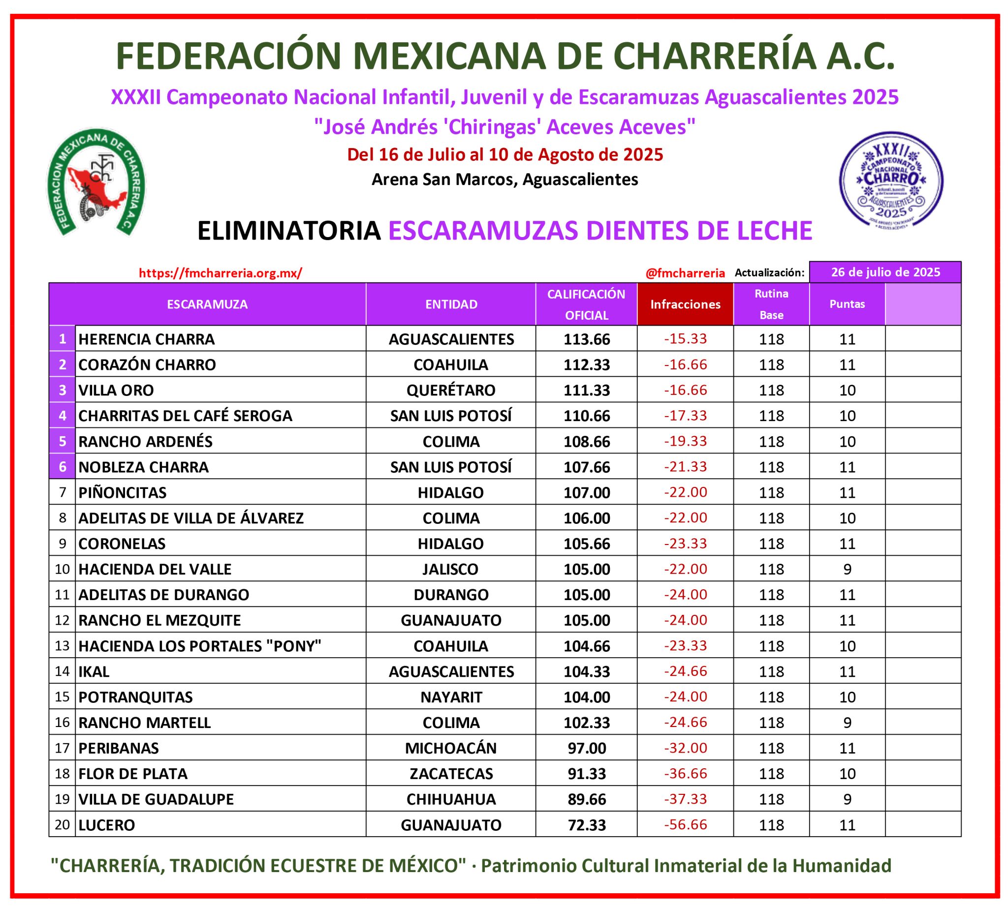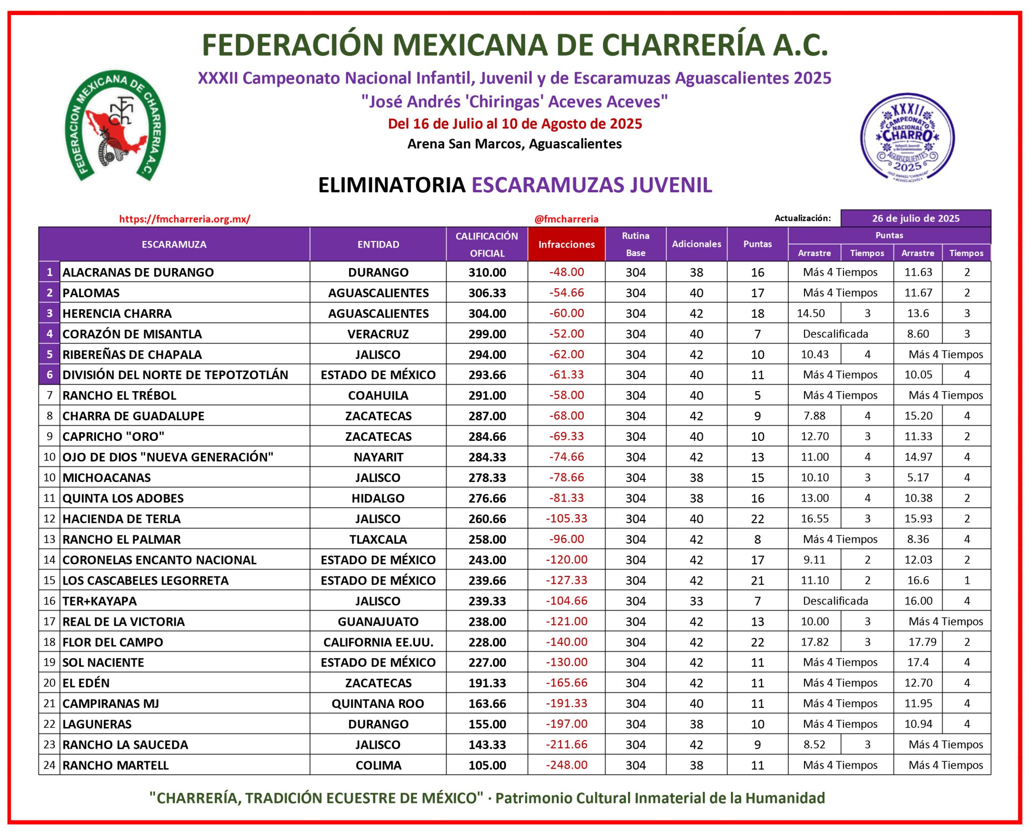 Tras dos competencias eliminatorias, los Bravos de Azuela de Querétaro se colocaron como líderes provisionales con 274 puntos, resultado que los perfila como uno de los favoritos de la categoría. Les siguen de cerca los Unidos de San Luis Potosí, quienes firmaron una destacada actuación con 263 unidades, mientras que la puntuación final de Rancho El Bayo, que también tuvo actividad este sábado, está pendiente de validación oficial.