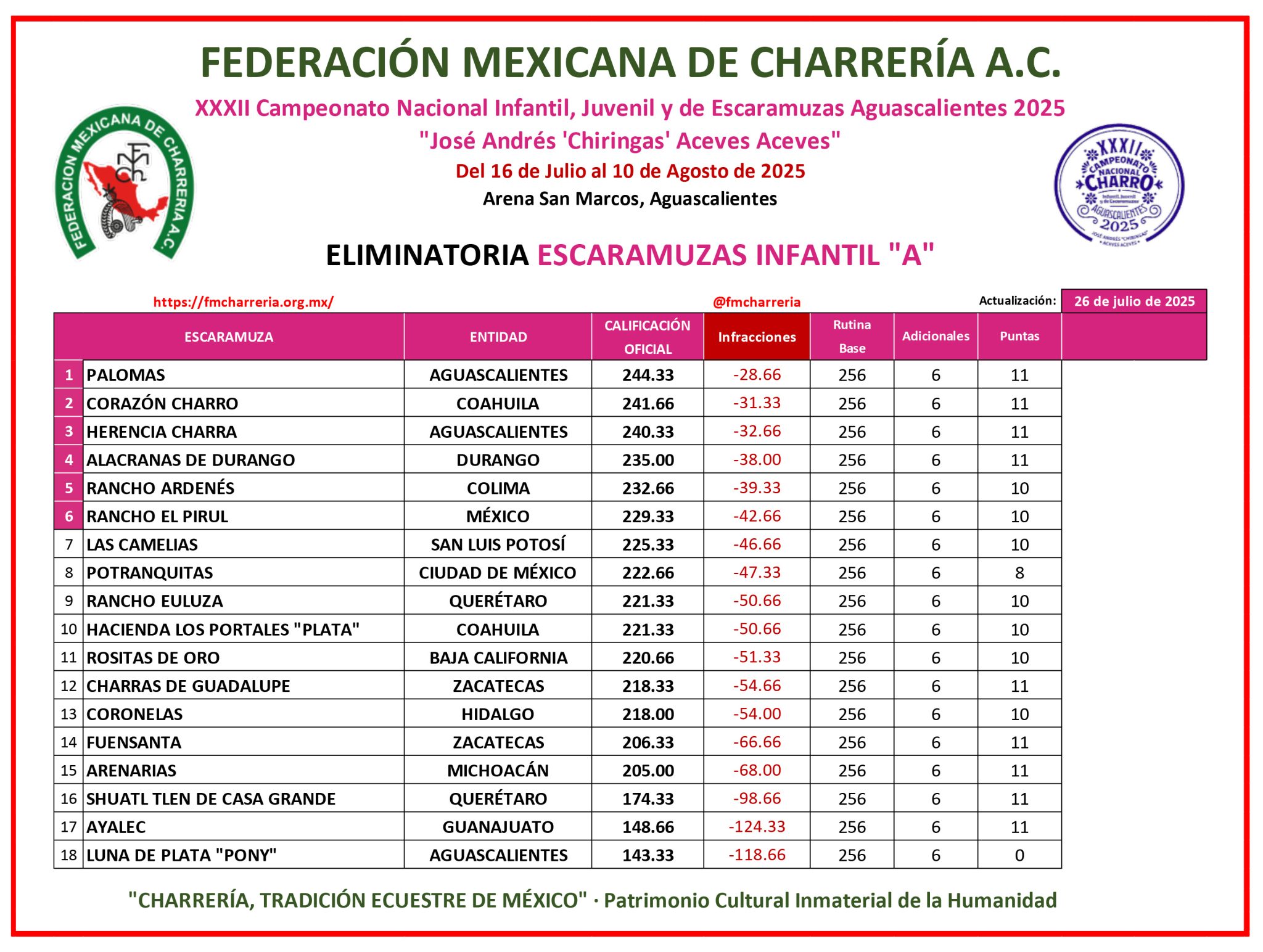 En la categoría Infantil “A” empataron Rancho Euluza de Querétaro y Hacienda Los Portales “Plata” de Coahuila con 221.33 puntos, habiendo tenido tanto 10 de la punta, ambas rutinas partieron de la suma base de 256 buenos y seis adicionales de ejercicios, y además fueron sancionadas con idénticas 50.66 infracciones.