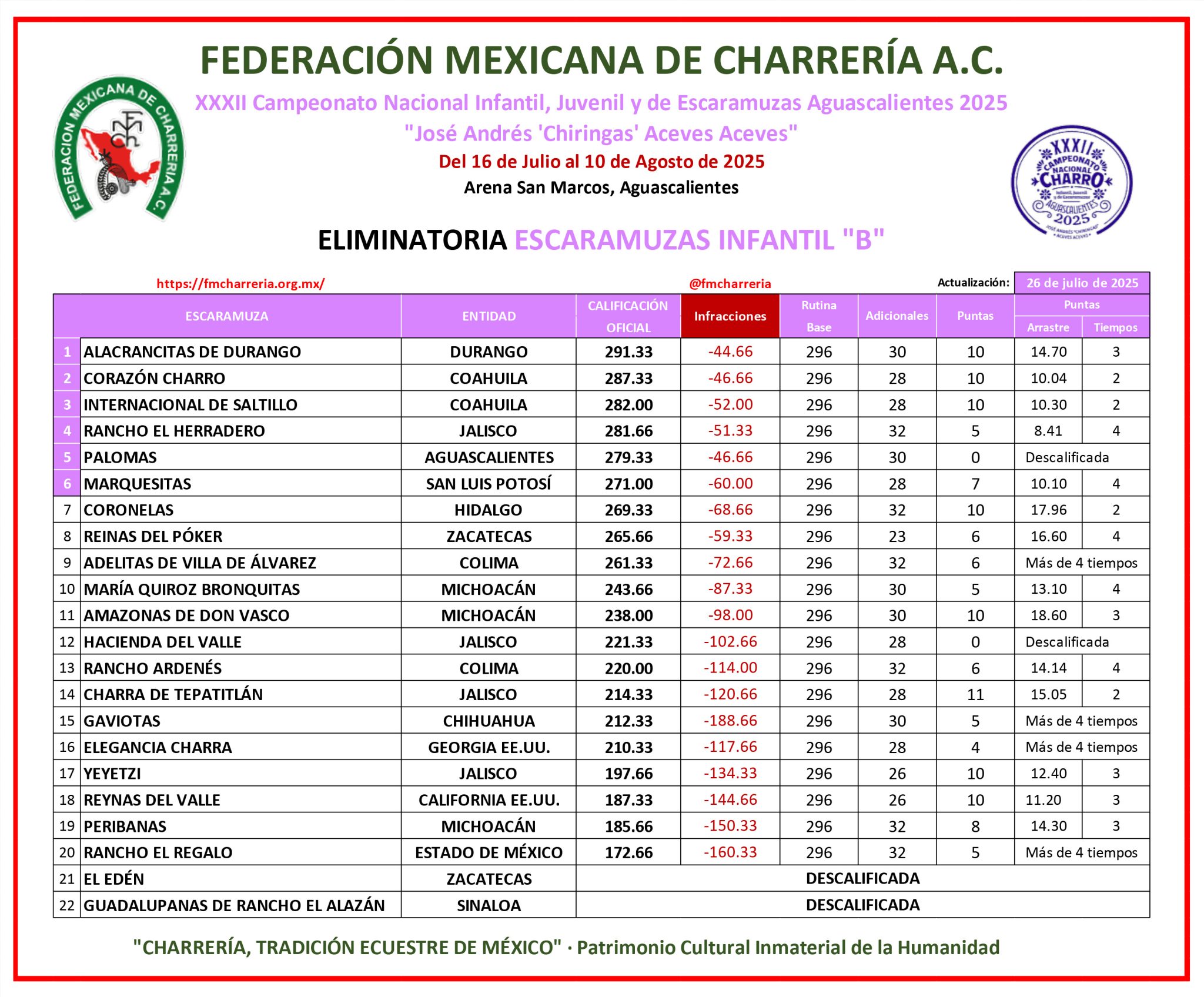 La primera charreada del día fue testigo del arranque de los charros completos Infantil “B”, con actuaciones destacadas que levantaron los ánimos del público en las gradas. El queretano Jorge Armando Quintanar Beltrán se colocó al frente de la clasificación con 208 puntos, seguido por José Carlos Hernández Ramos de Jalisco con 175 unidades.