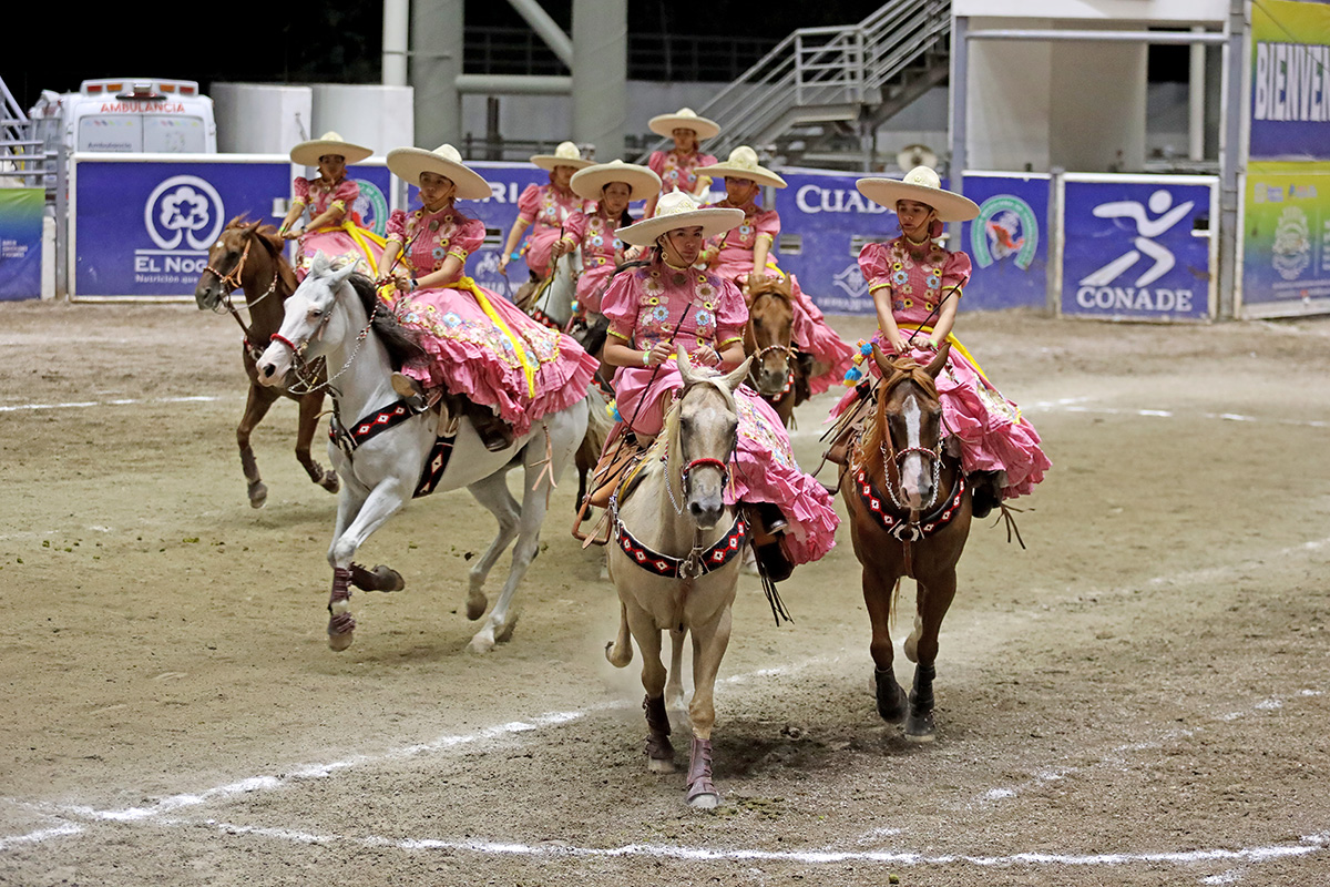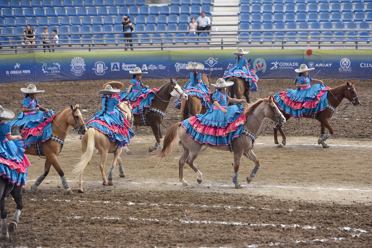 Junto a ellas actuaron Camila Nicole Martínez Vázquez, María René Cota Ramos, Briana Citlali Arellano Cruz, María Fernanda y Noelia Fernanda Lizárraga Ontiveros y Danna Sofía Díaz Torres, federadas con la asociación Lienzo Charro Guadalupano de la capital estatal, La Paz.
