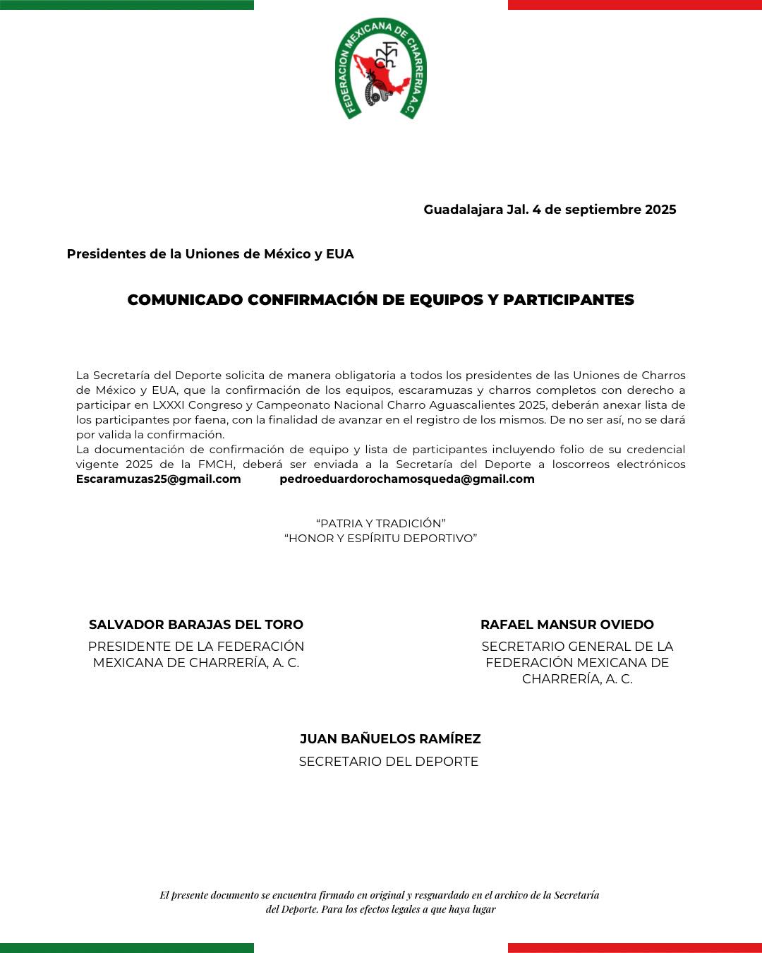 La Federación Mexicana de Charrería, a través de su Secretaría del Deporte, informa a toda la comunidad charra que el próximo 10 de septiembre de 2025 vence el plazo para que equipos, escaramuzas y charros completos confirmen su registro para poder participar en el LXXXI Congreso y Campeonato Nacional Charro Aguascalientes 2025, la máxima fiesta del deporte nacional por excelencia.