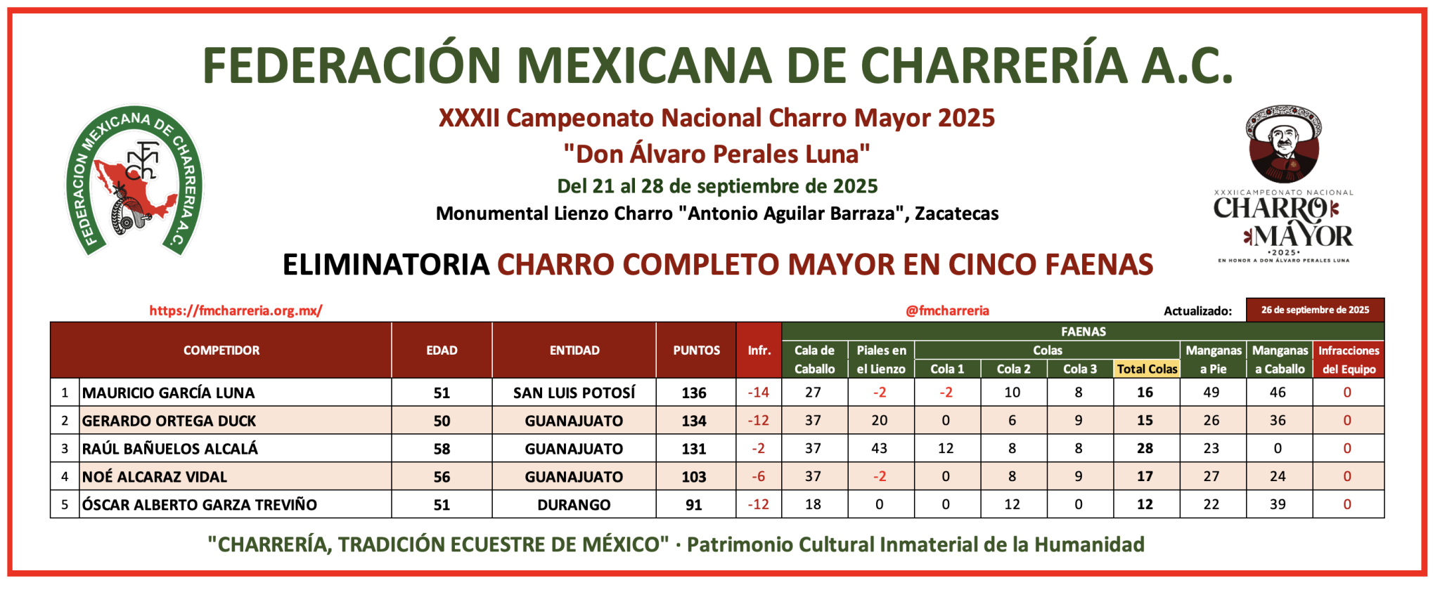 Mauricio García Luna, por su parte, se colocó en el primer sitio de la modalidad de charros completos en cinco faenas, ganando la primera eliminatoria con 136 unidades, parejo duelo pues le siguieron tres elementos guanajuatenses: Gerardo Ortega Duck obtuvo 134 tantos, 131 de Raúl Bañuelos Alcalá y 103 puntos de Noé Alcaraz Vidal, y Óscar Garza Treviño de Durango firmó 91 buenos.
