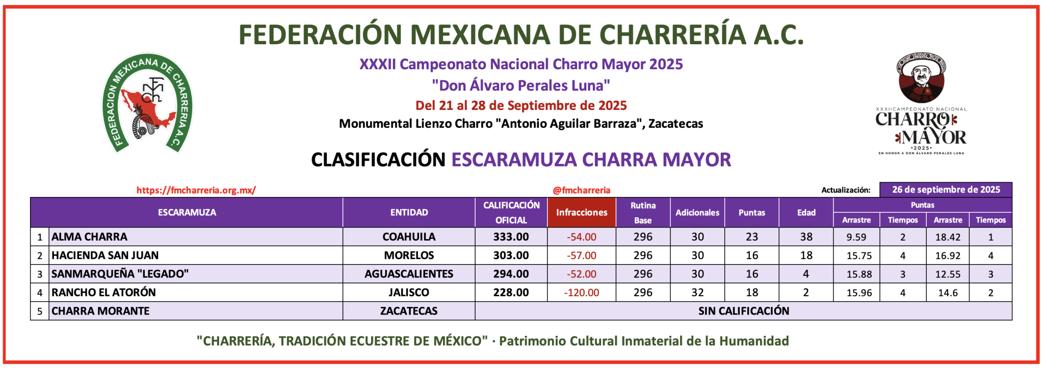 En el aspecto de la rama Femenil, correspondiente a las damas charras de categoría Mayor, buena actuación de la escuadra Alma Charra de Coahuila, que finalizó con 333.00 puntos y está en primera posición de un certamen que, en esta rama, se disputa a una sola vuelta.