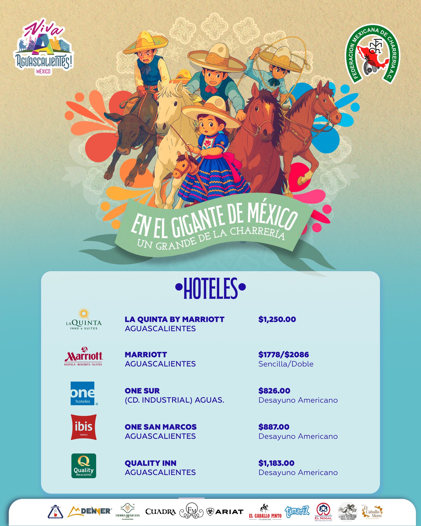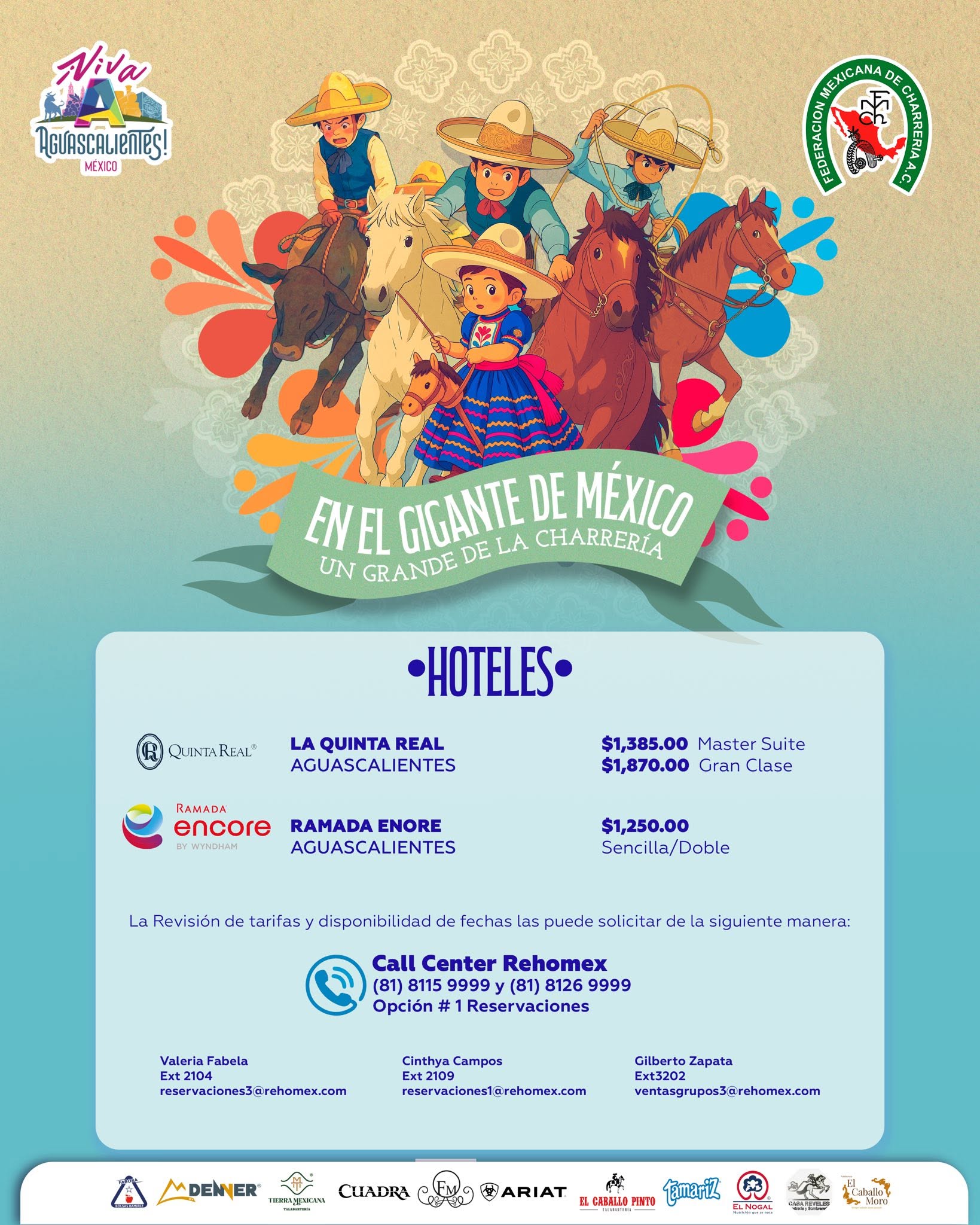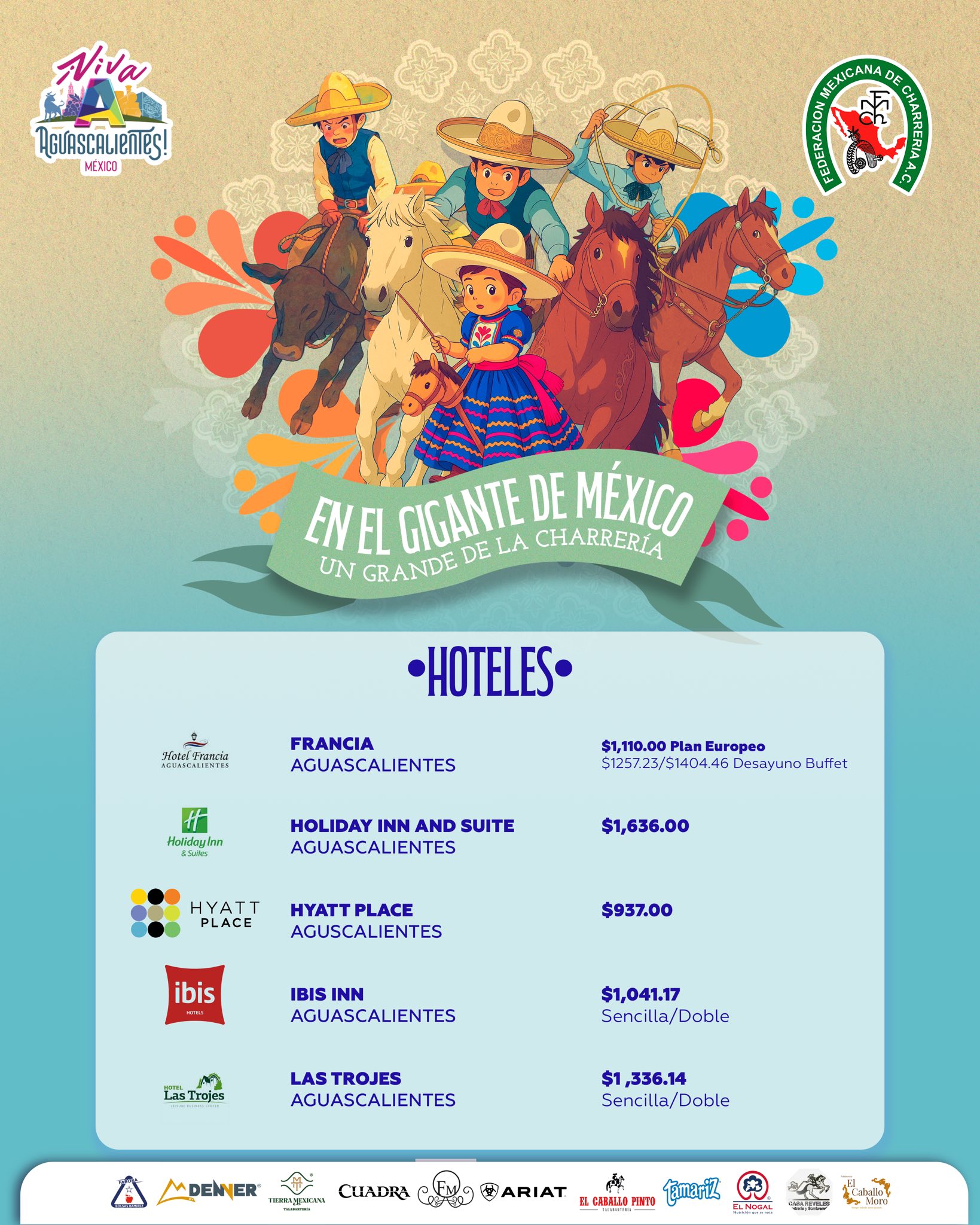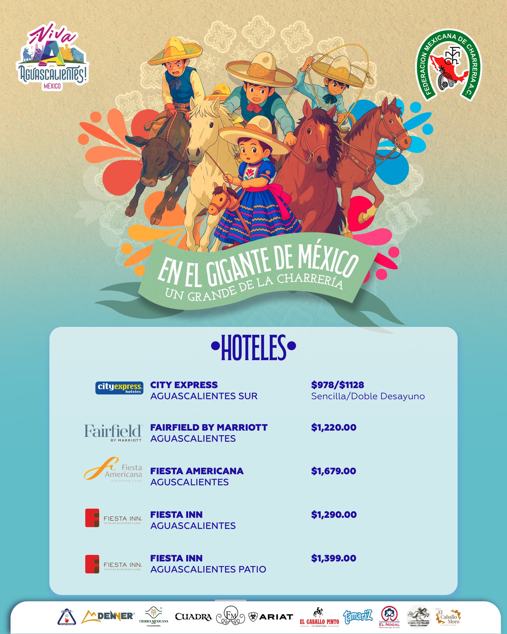 • En este espacio pueden consultarse los hoteles y las tarifas preferenciales que se ofrecen en Aguascalientes para todos los visitantes al gran evento del semillero de la Charrería