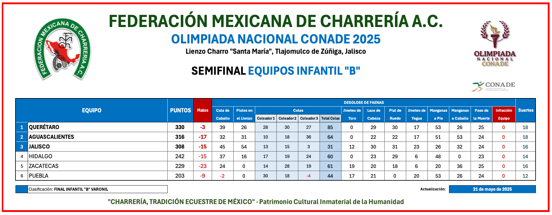 El escuadrón de Aguascalientes ganó la primera competencia de la ronda semifinal de la categoría Infantil “B” con 316 puntos, sumando sus primeros 32 buenos de la cala de caballo de José Juan Zermeño Jardón, dos piales en el lienzo de Rubén Aguilera González para obtener 31 tantos, así como 64 unidades del coleo, 36 de Santiago Martín Preciado, 18 de Tadeo Alejandro Martínez y 10 más de José Alfredo Gallo.