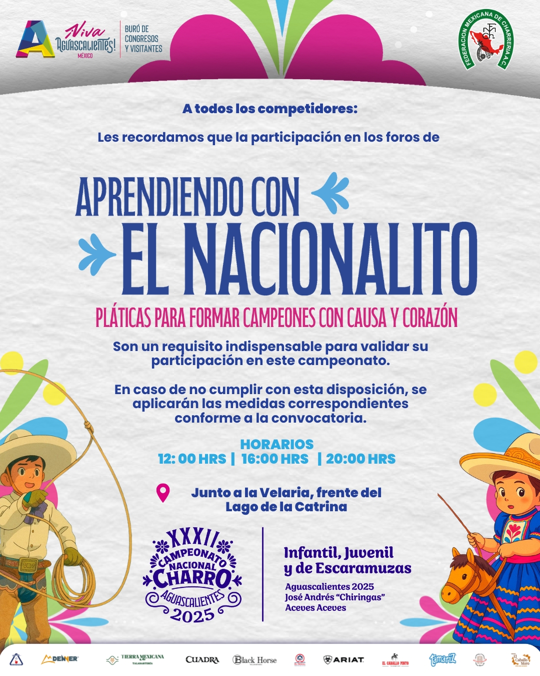 En el marco del XXXII Campeonato Nacional Charro Infantil, Juvenil y de Escaramuzas Aguascalientes 2025 “José Andrés ‘Chiringas’ Aceves Aceves”, la Federación Mexicana de Charrería recuerda a todos los competidores que la participación en los foros de “Aprendiendo con El Nacionalito” es un requisito indispensable para validar su intervención en este campeonato.