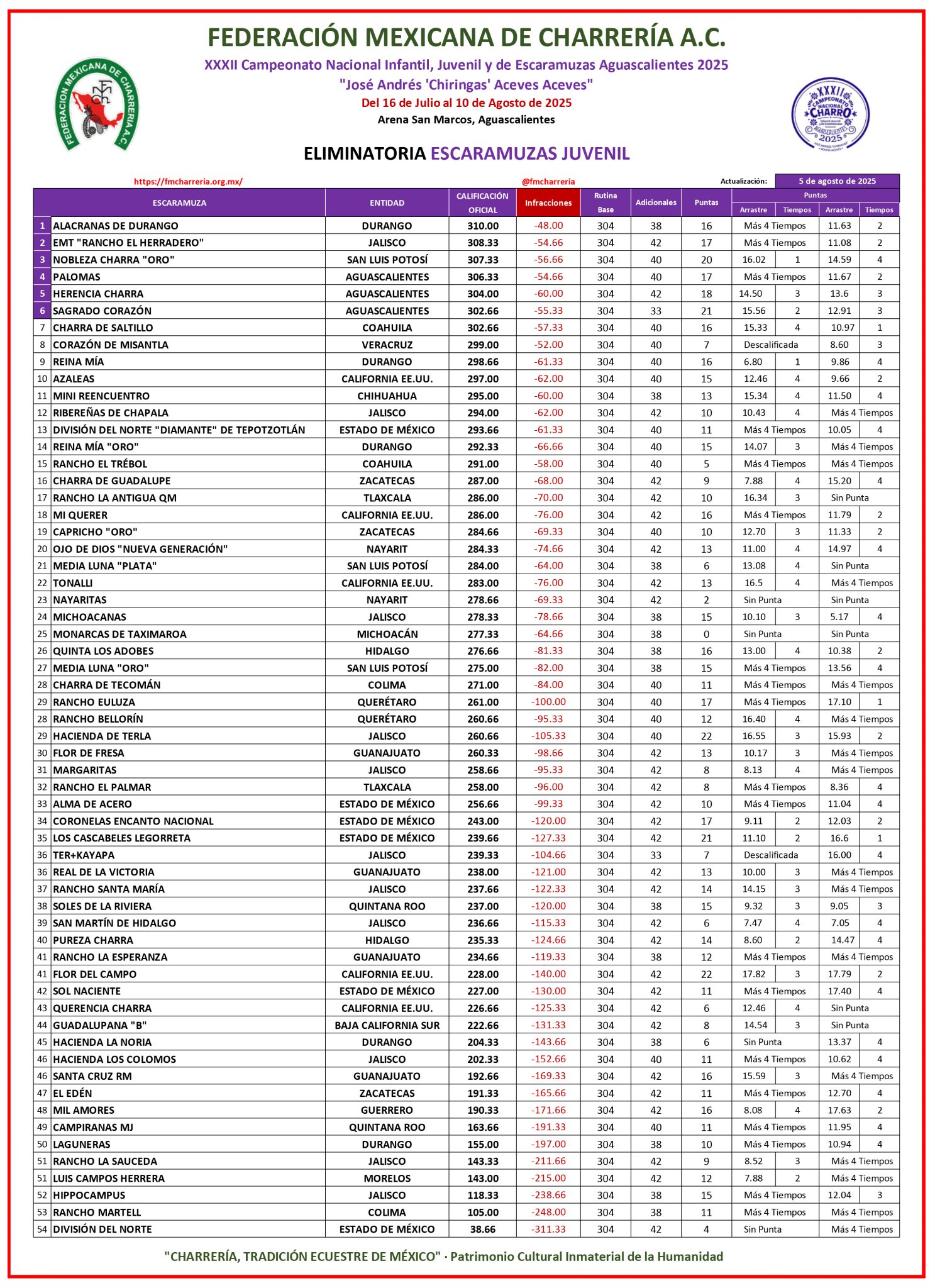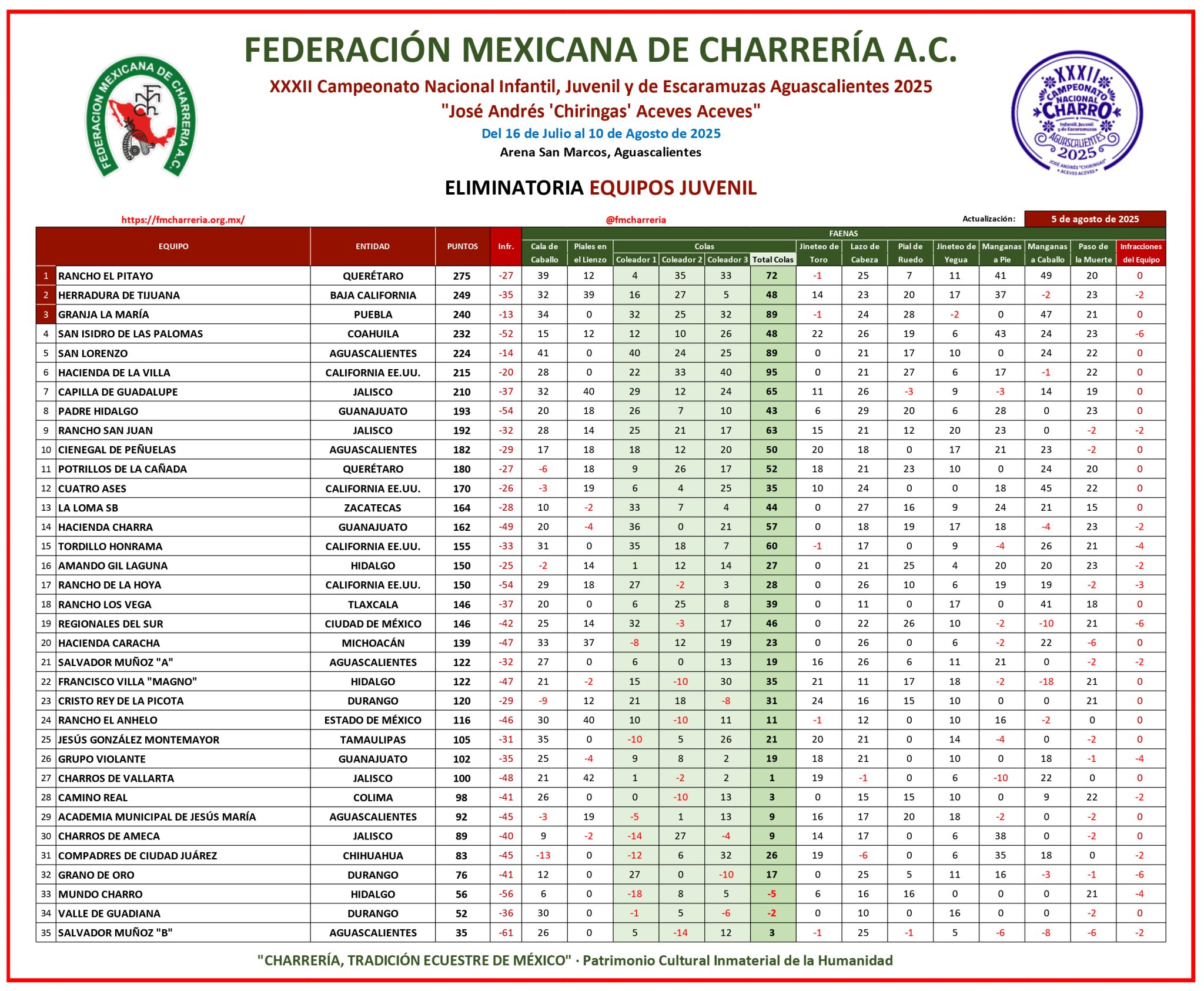 Más temprano, Capilla de Guadalupe de Jalisco concluyó con 210 puntos, quedándose corto en sus aspiraciones; Padre Hidalgo de Guanajuato firmó 193 unidades y Rancho San Juan de Jalisco cerró con 192 buenos en una competencia sumamente equilibrada.
