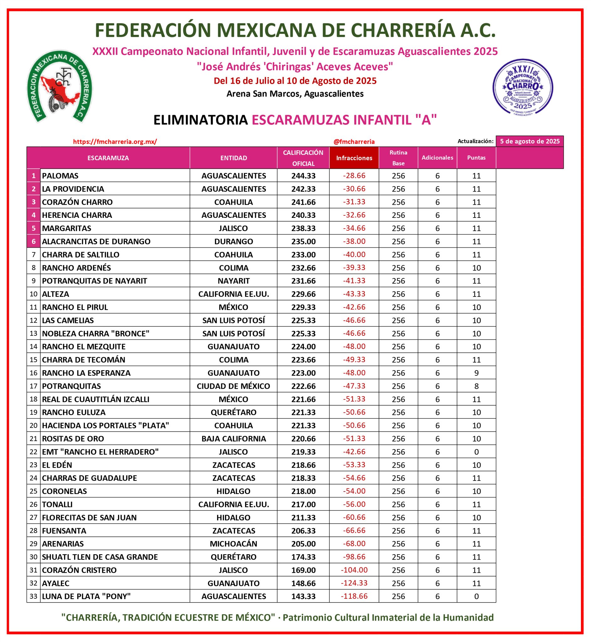 Por el sector Infantil “A”, la marca de 219.33 puntos alcanzó la escaramuza Escuela Municipal de Tlajomulco “Rancho El Herradero” de Jalisco, que desafortunadamente no logró tantos positivos en punta, asegurando por su rutina la friolera de 262 buenos, 256 de suma base de sus doce ejercicios y seis adicionales, pero teniendo 42.66 de infracción.