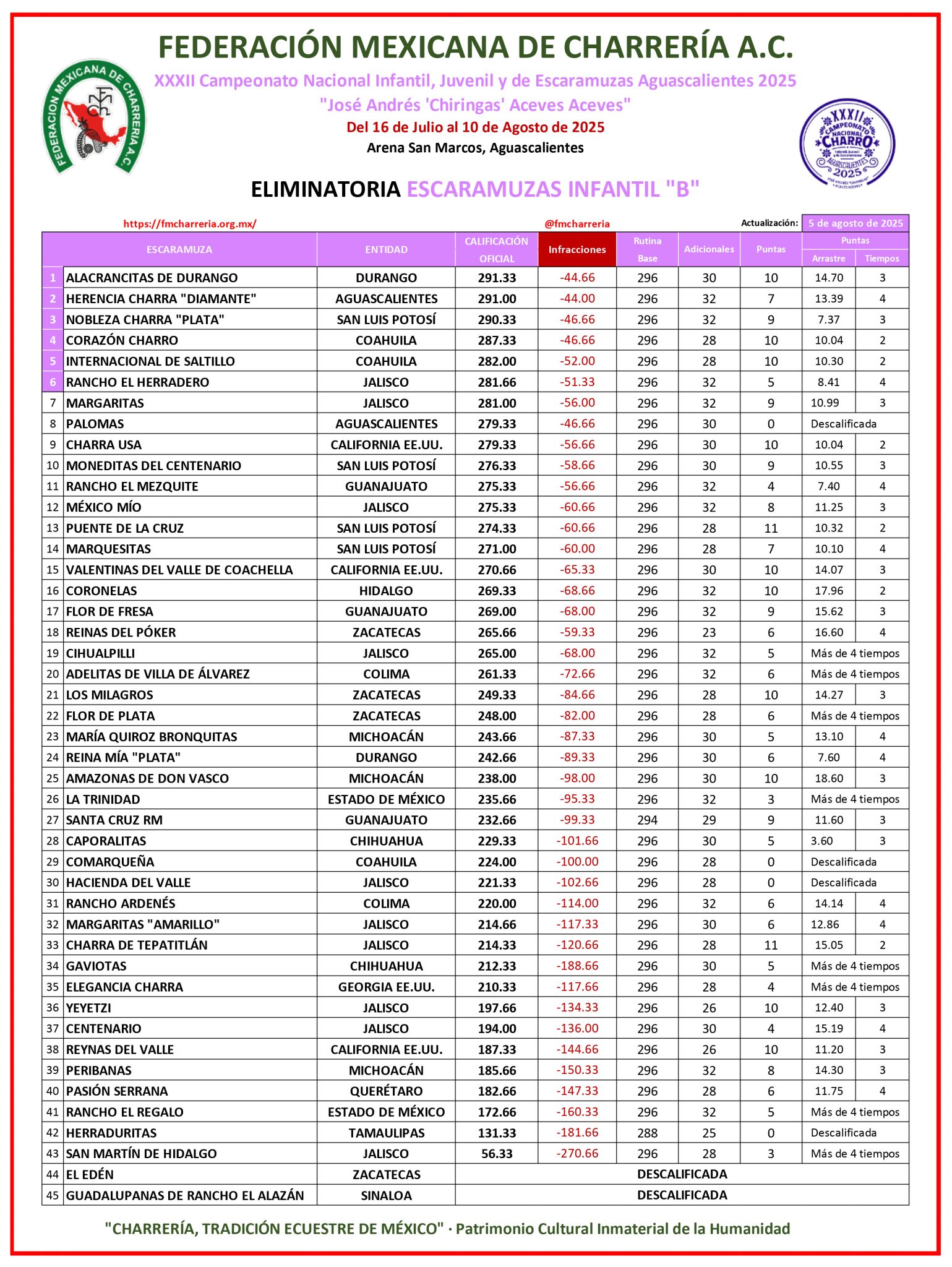 Por Margaritas Infantil “B” de Jalisco, su calificación oficial fue de 281.00 puntos, aprovechando los nueve que logró Jessica Aylin Gómez Maldonado en la punta, con arrastre de 10.99 metros en tres tiempos; aseguraron 296 de la suma base de su rutina y 32 adicionales, teniendo de infracciones 56 malos debido a defectos de ejecución.