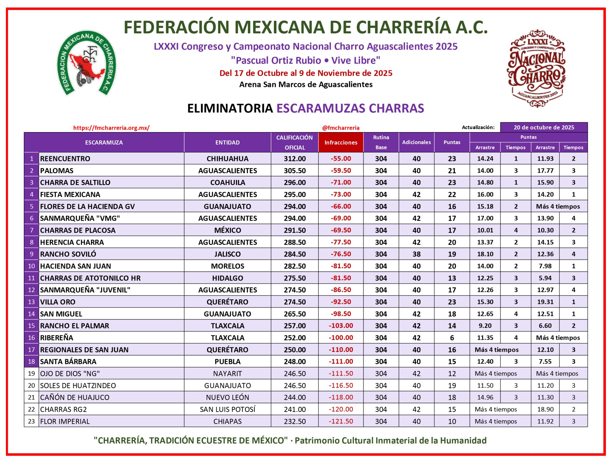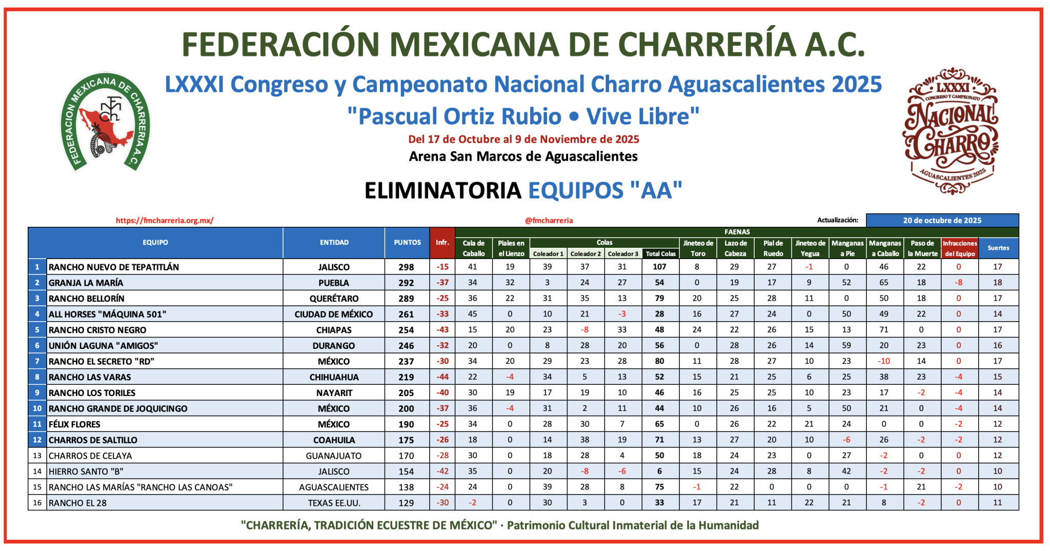 Rancho Nuevo de Tepatitlán, Jalisco, con su actuación logró cambios importantes en la segunda competencia de este lunes 20 de octubre en el LXXXI Congreso y Campeonato Nacional Aguascalientes 2025 “Pascual Ortiz Rubio – Vive Libre”, que se desarrolla en la Arena San Marcos.