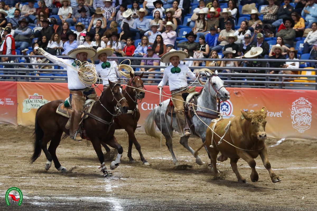 En un ambiente auténtico de Campeonato Nacional, Villa Oro cuajó dos piales y seis manganas; Julio Coss y León entrega 44 en la segunda faena y una tercia en la suerte reina de la charrería para 74; Óscar Pérez colabora con tres a caballo para 79 y el lazo de cabeza.