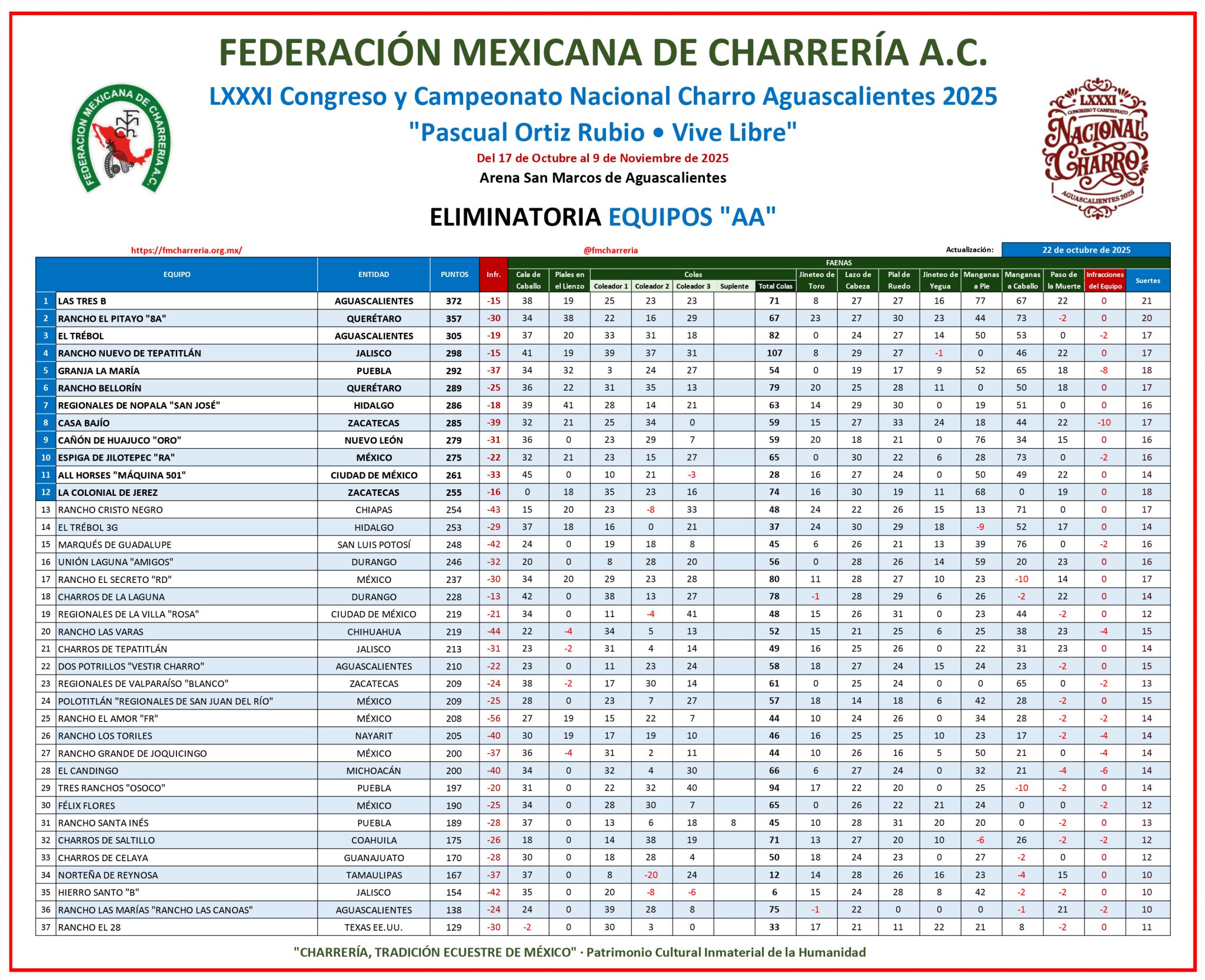 Han concluido seis jornadas de actividades del LXXXI Congreso y Campeonato Nacional Charro Aguascalientes 2025 “Pascual Ortiz Rubio – Vive Libre” que se desarrolla en la Arena San Marcos de la capital hidrocálida, y poco a poco van tomando forma los cuadros de semifinalistas que accederán a la siguiente ronda, tanto en charros como en las escaramuzas.