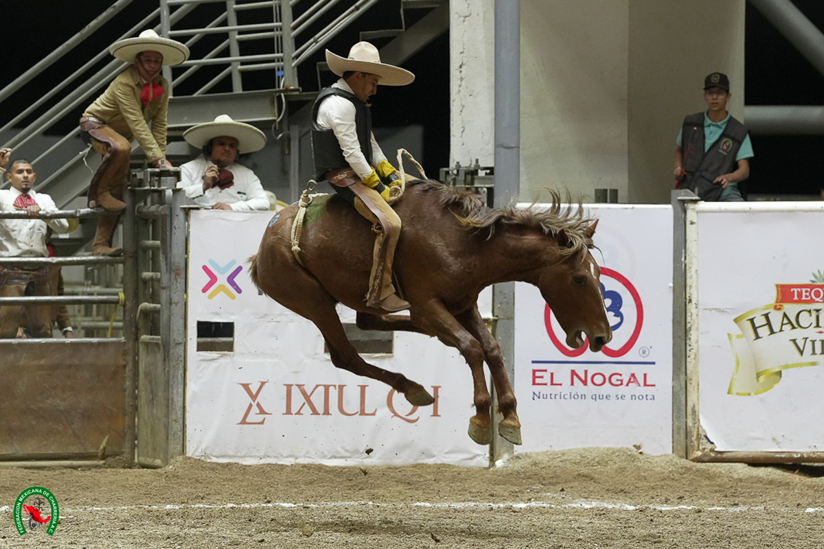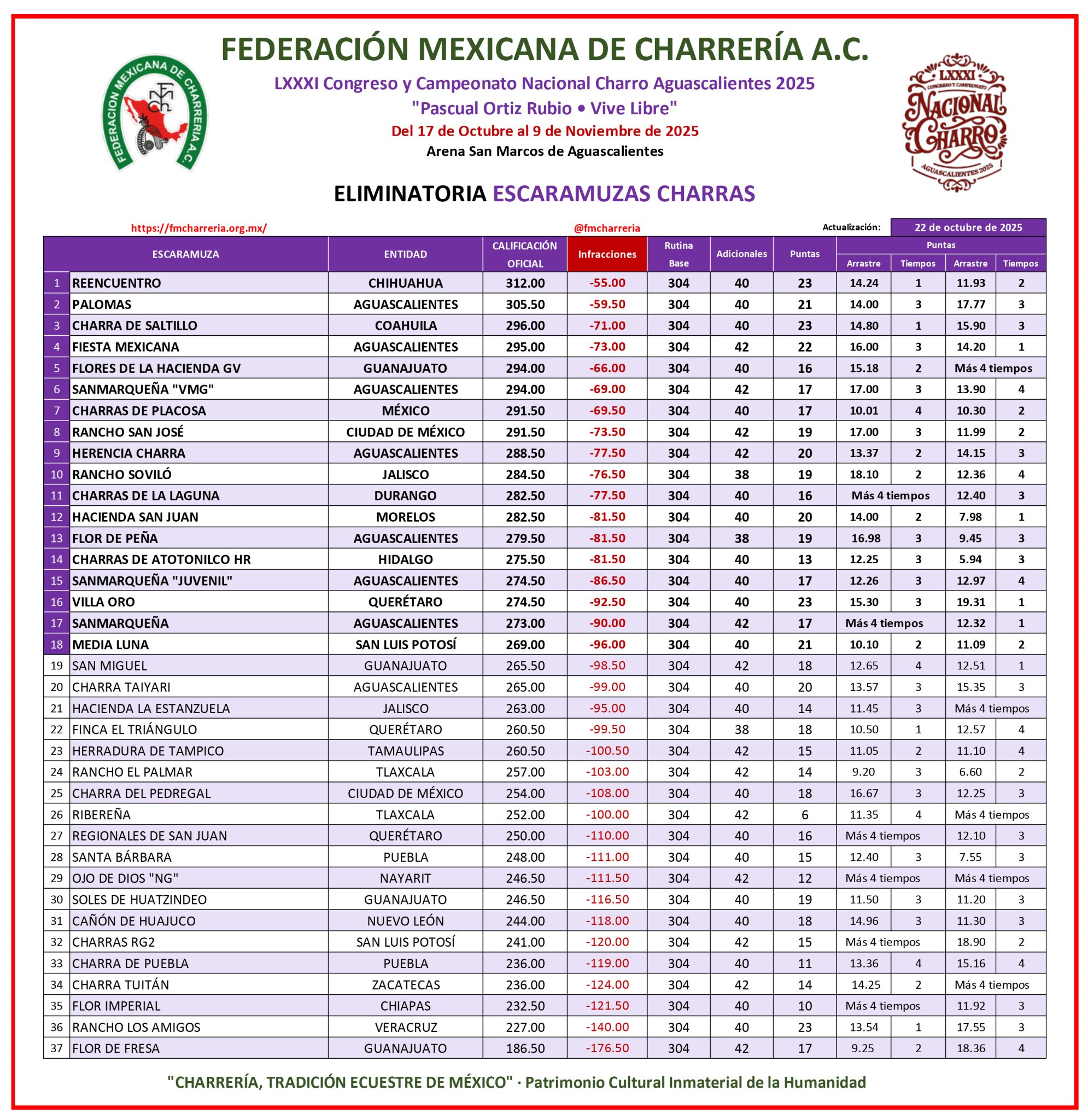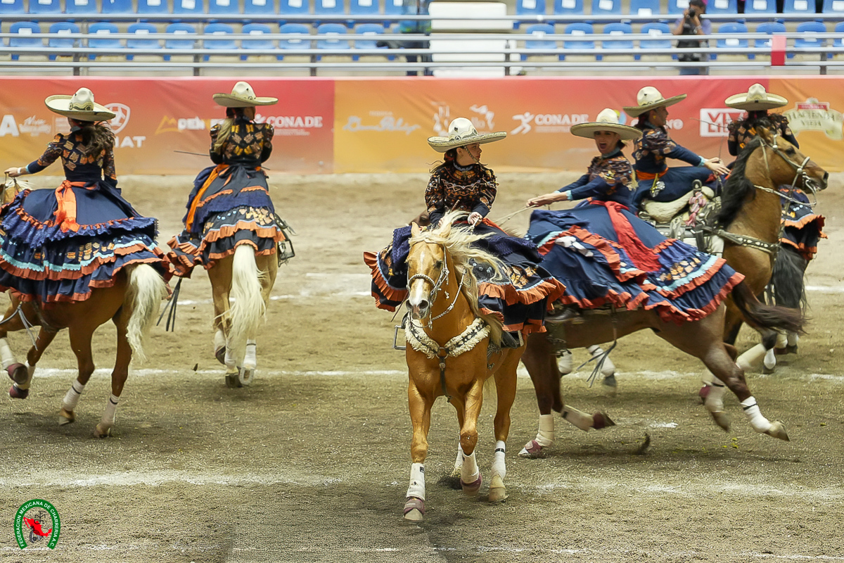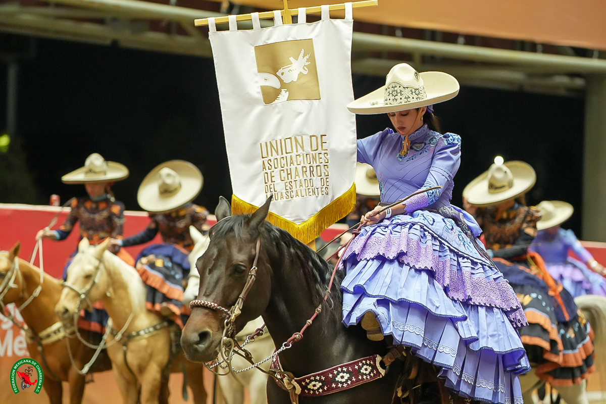 En el aspecto femenil, la escaramuza Flor de Peña de Aguascalientes logró una presentación con 279.50 puntos de promedio, que les coloca dentro de zona de semifinales, en el puesto 13, recordando que serán 18 ramilletes de damas charras las que clasificarán a la siguiente ronda; sin embargo, restan todavía más de 80 escaramuzas por participar.