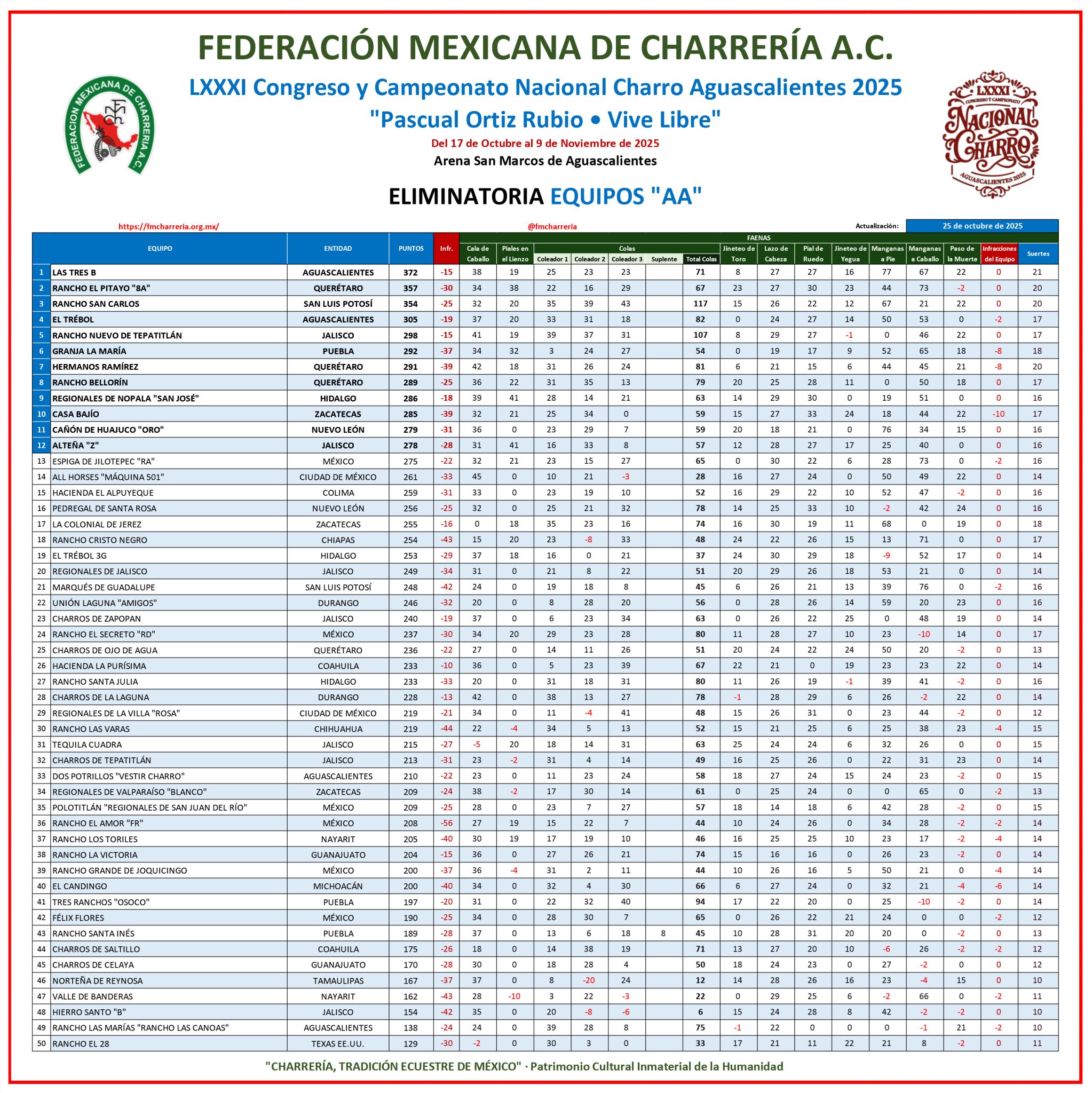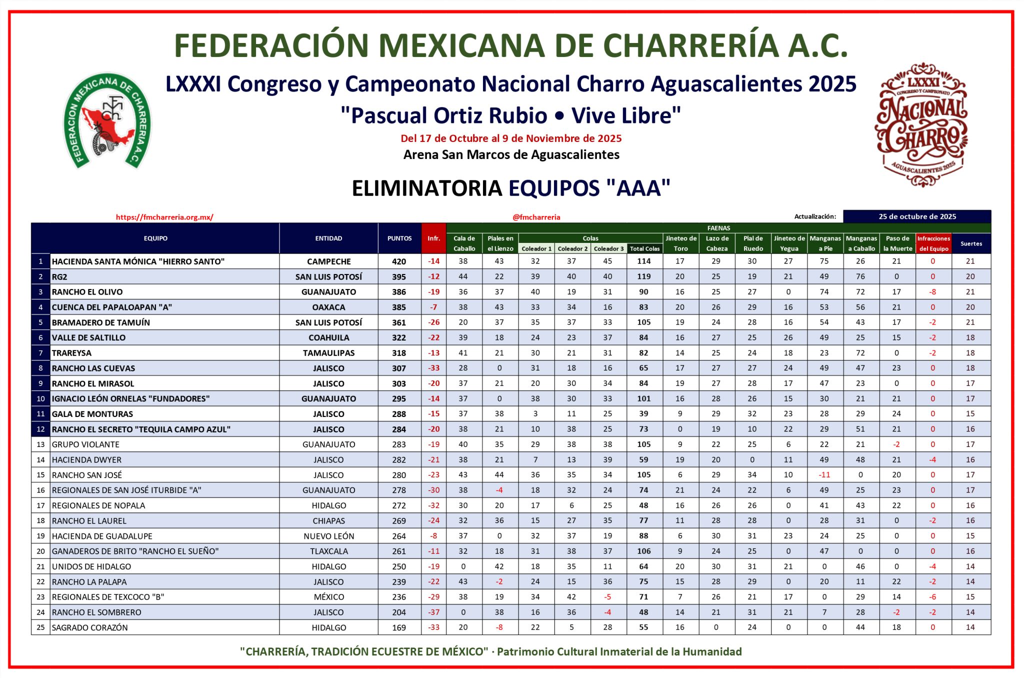Con una soberbia actuación de 420 puntos, el elenco Hierro Santo de Ciudad del Carmen, Campeche, ganó la mejor charreada en lo que va del LXXXI Congreso y Campeonato Nacional Charro Aguascalientes 2025 “Pascual Ortiz Rubio – Vive Libre”, que se desarrolla en la Arena San Marcos, donde todo el mundo rebasó la excelencia.