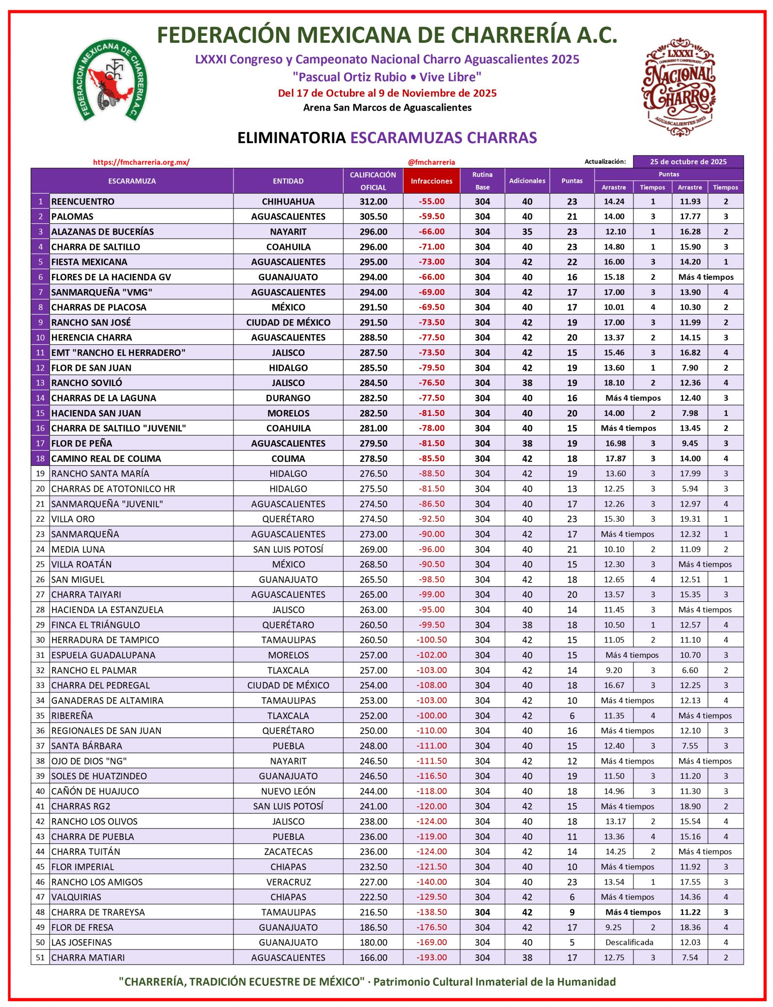En otros resultados, Villa Roatán del Estado de México realizó una presentación con mucho corazón y alegría, y con promedio de 268.50 unidades se instala por ahora en la posición 25, fuera de zona de final, lo mismo que la Charra de Trareysa de Tamaulipas, la cual finalizó a primera hora de este sábado con 216.50 buenos de promedio oficial.
