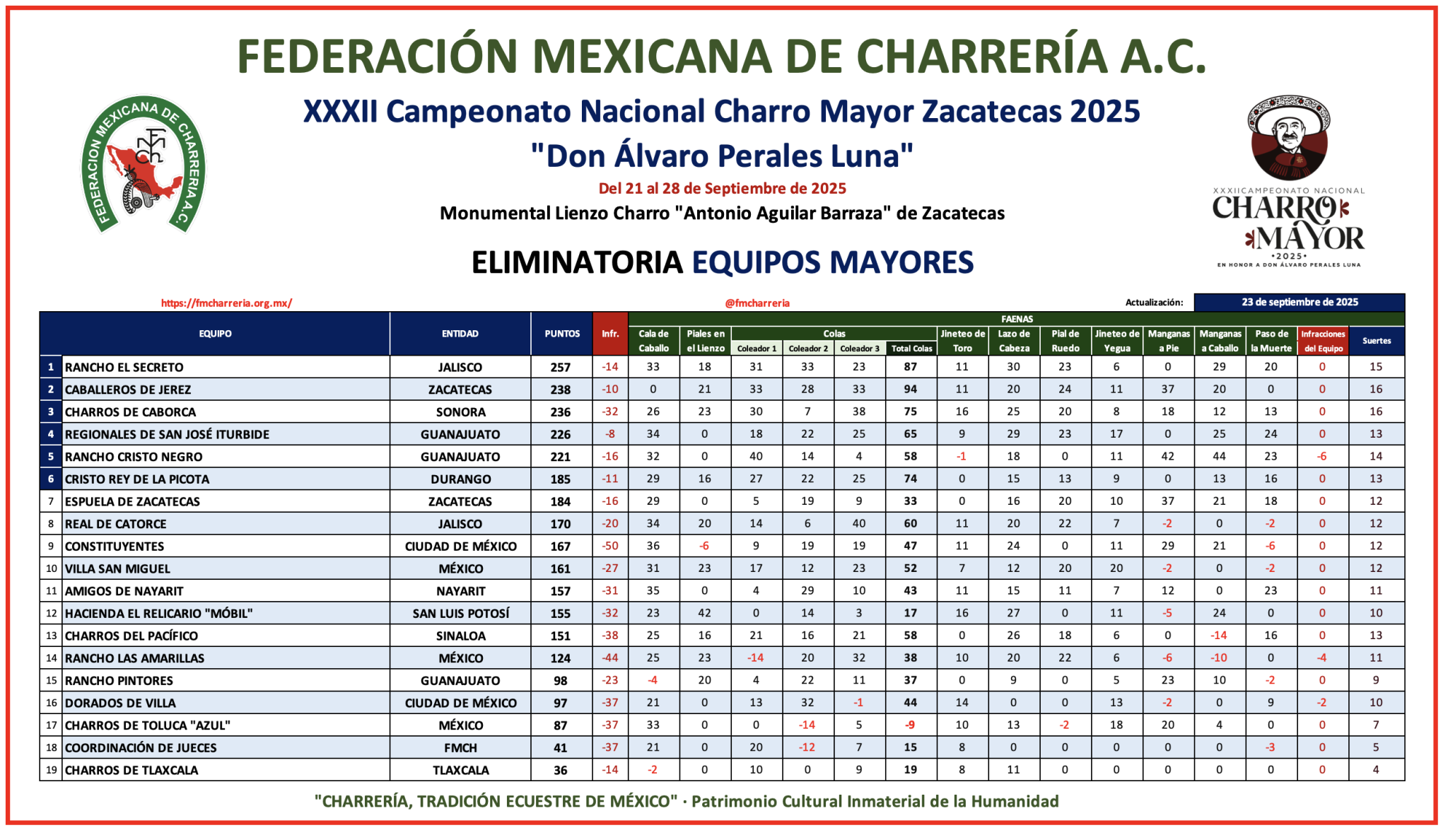 El XXXII Campeonato Nacional Charro Mayor Zacatecas 2025 “Don Álvaro Perales Luna” continúa sus actividades en el Monumental Lienzo Charro “Antonio Aguilar Barraza”, donde se disputaron dos competencias que dejaron movimientos importantes en la tabla clasificatoria de la categoría de Charros Mayores.