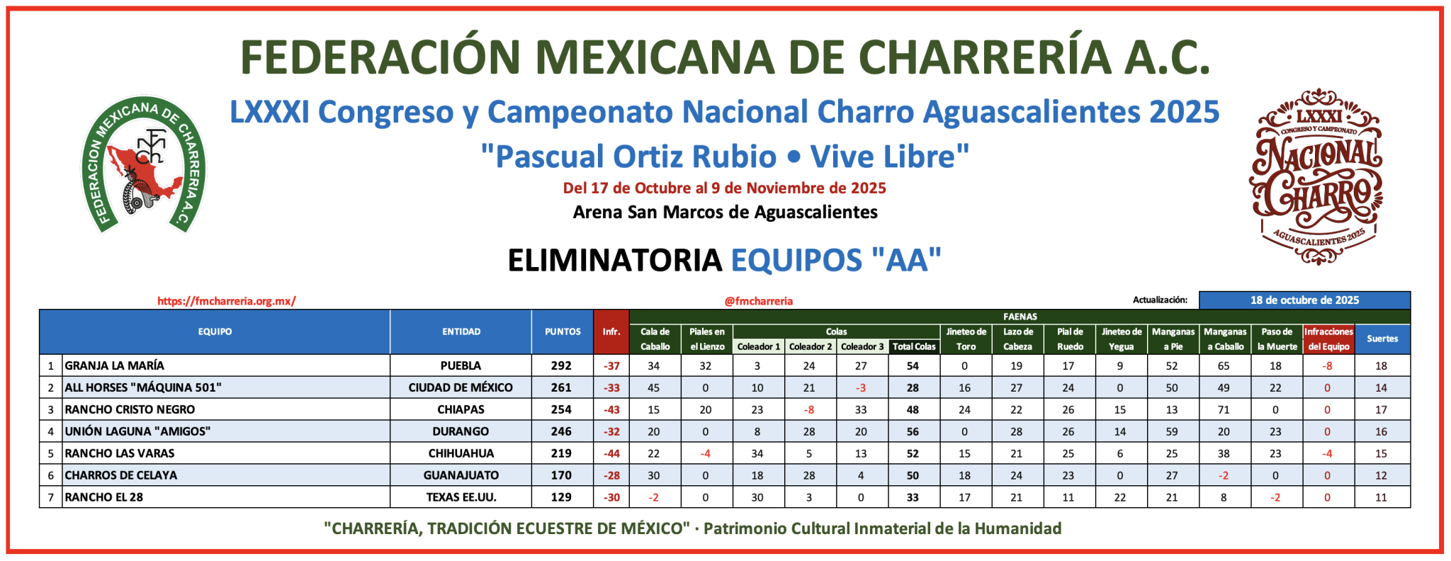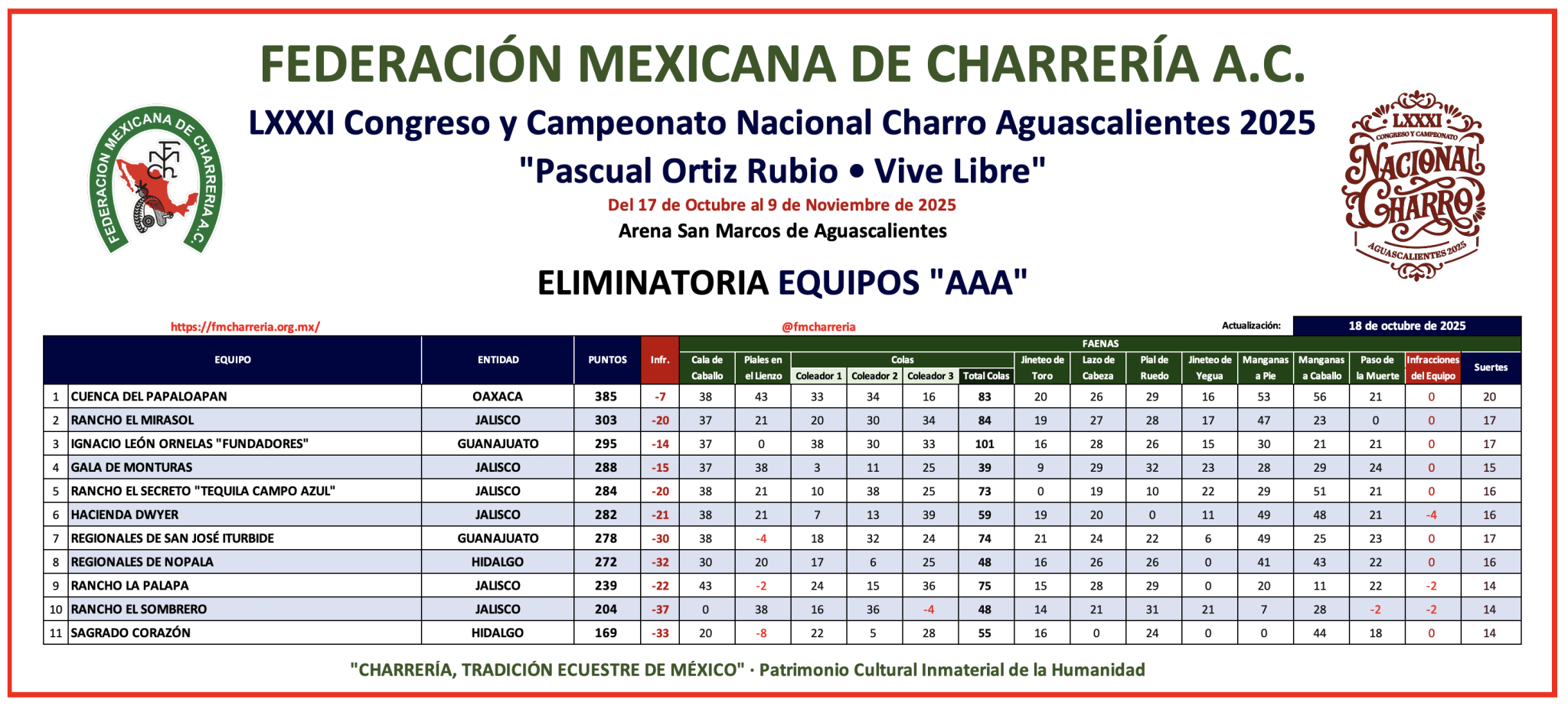 En la misma competencia, dos escuadras de la categoría “AA” saltaron al ruedo. Los capitalinos de All Horses “Máquina 501” sufrieron en colas, pero gracias a cuatro manganas de cuenta cerraron con 261 puntos, marca que les tiene por el momento en la segunda posición de este sector, que lidera lejanamente Granja La María de Puebla, con sus 292 unidades.