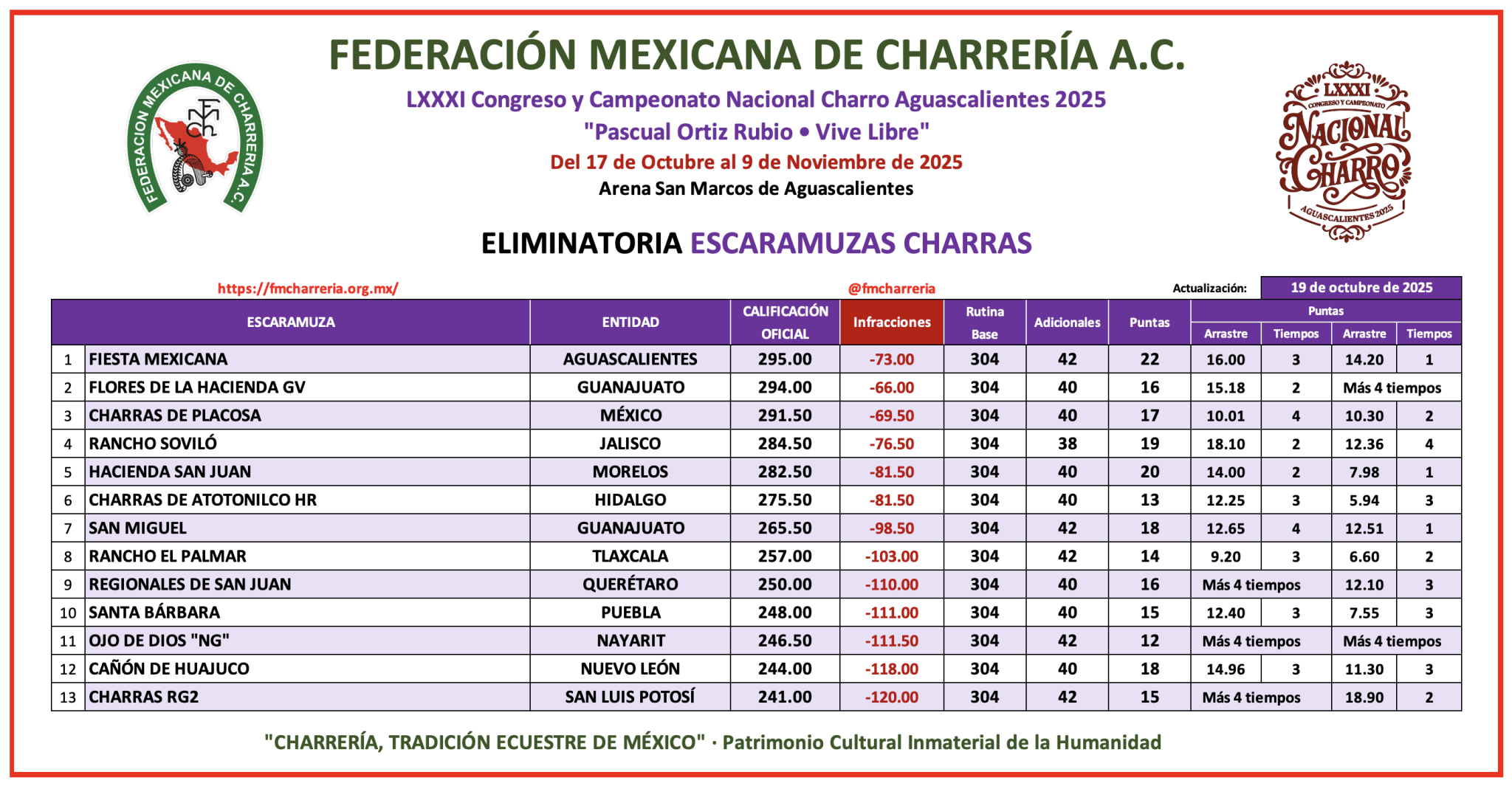 En la tercera posición se encuentran las mexiquenses Charras de Placosa, que han logrado 291.50 buenos. Así, la lucha por los primeros puestos promete emociones fuertes y máxima exigencia en las próximas jornadas