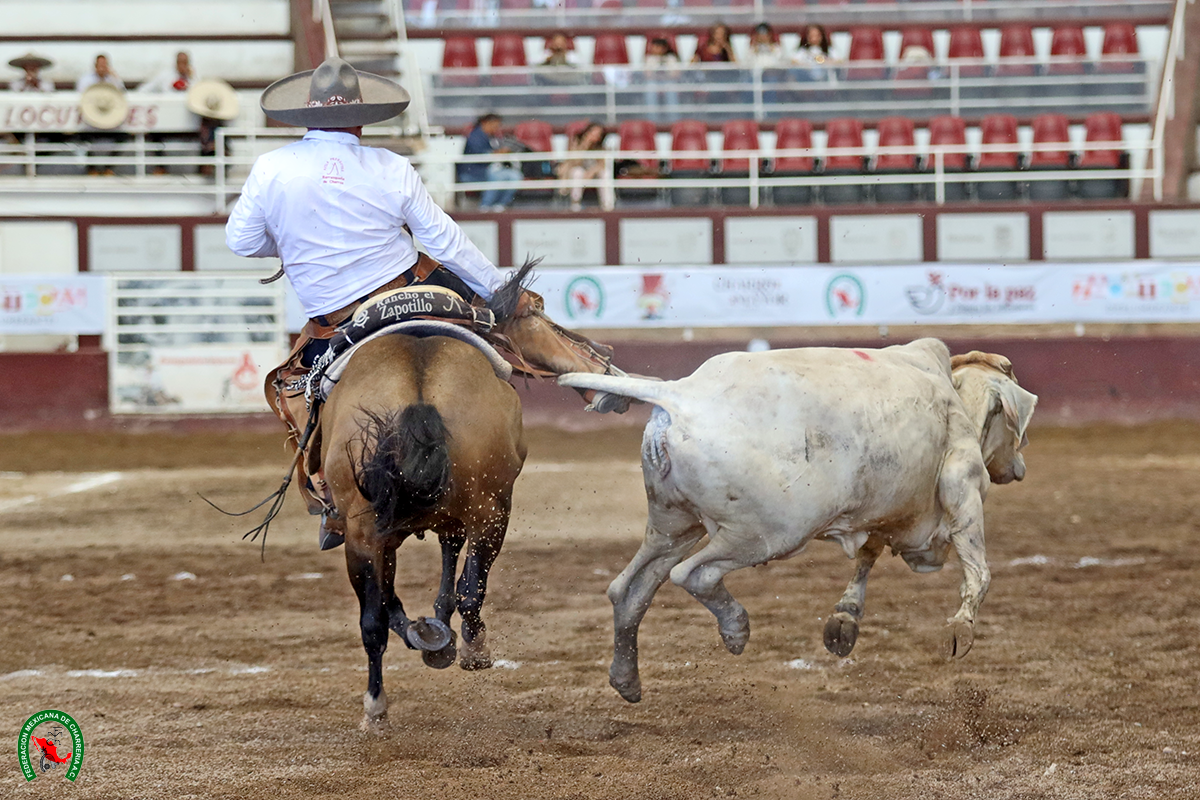 Mientras tanto, Rancho Las Amarillas del Estado de México abrió su actuación con la cala de caballo de 25 unidades por parte de Aldo Adolfo Elorza Vera, un pialazo de 23 que acertó Rogelio Hernández Barrera, de 73 años de edad, y en colas fueron 38 totales, de los que 32 fueron obra de José Escamilla Bravo.
