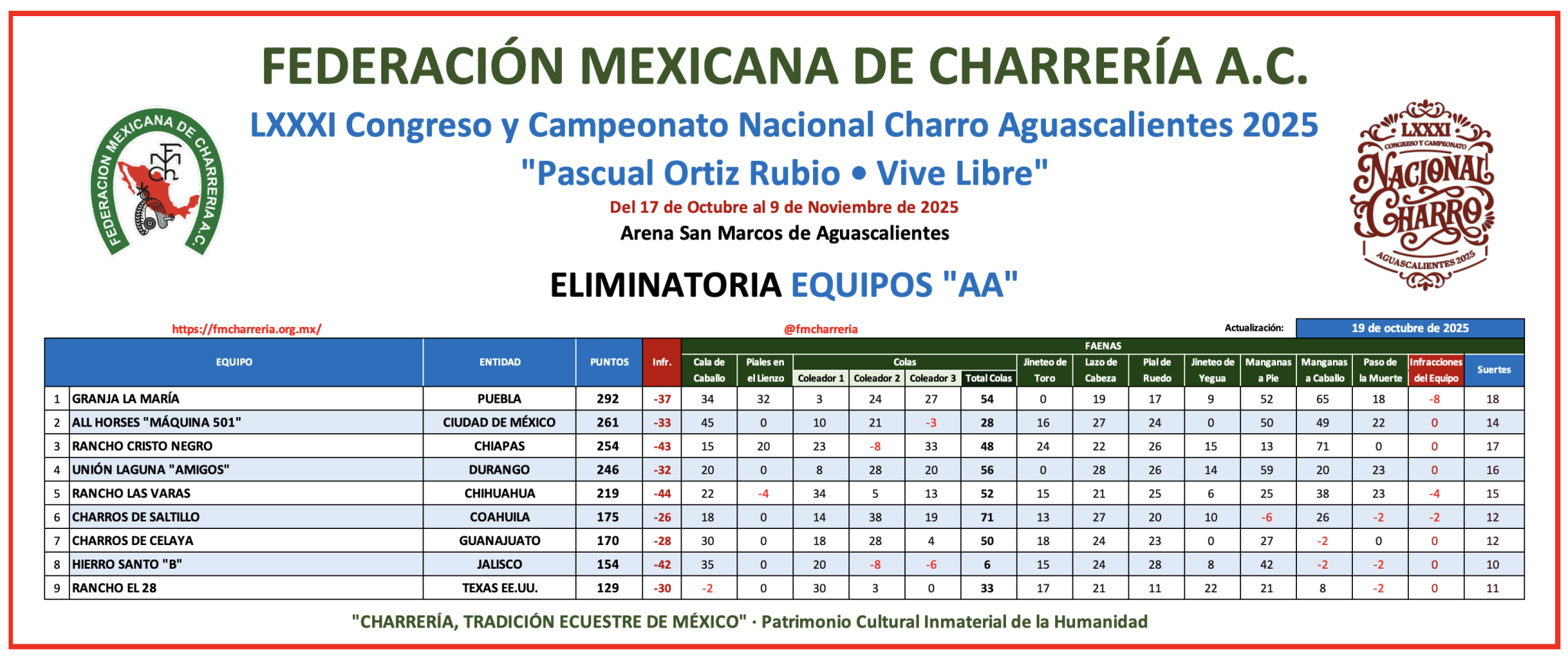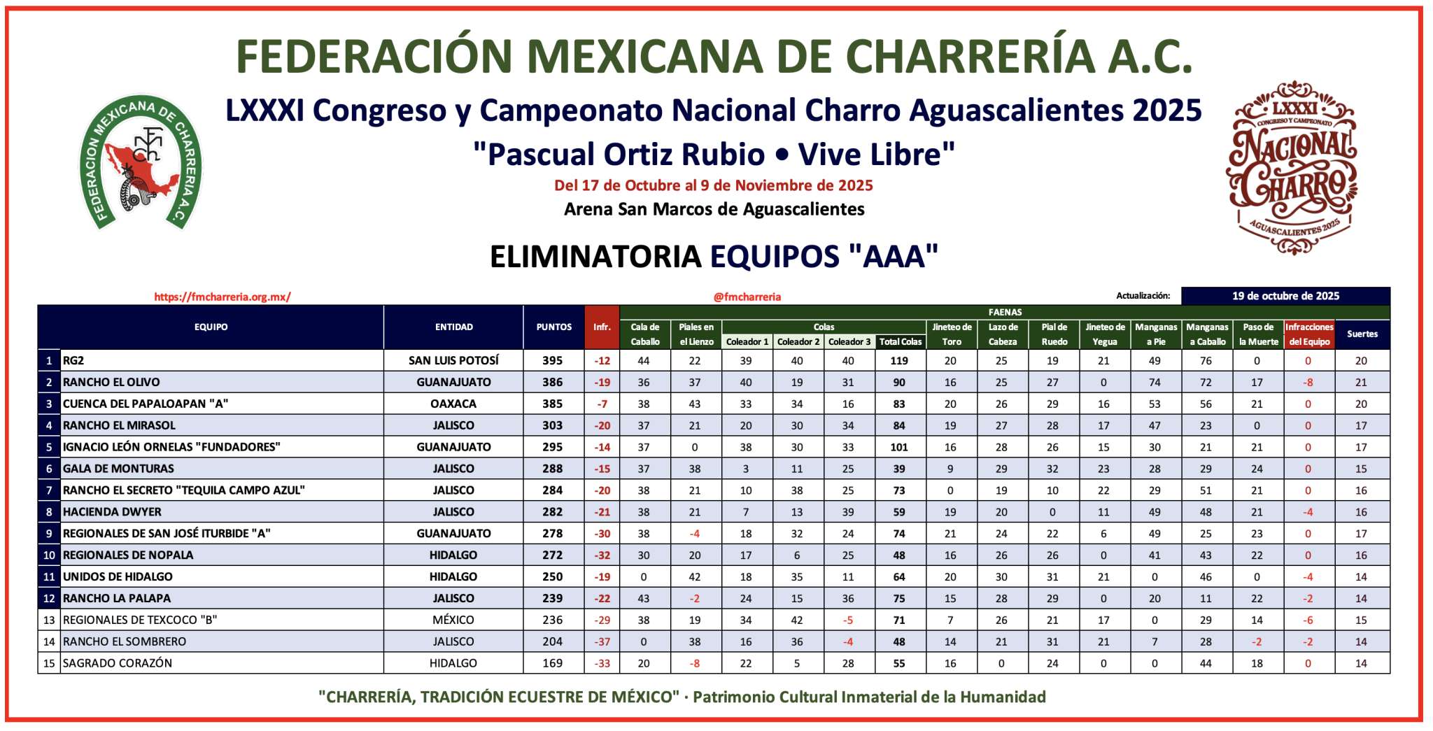 El LXXXI Congreso y Campeonato Nacional Charro Aguascalientes 2025 continúa mostrando un nivel competitivo alto y variable entre las primeras jornadas de actividades en la Arena San Marcos. La disputa por los primeros lugares se mantiene abierta y promete intensificarse en las siguientes charreadas, ya que restan más de veinte jornadas todavía por celebrarse.