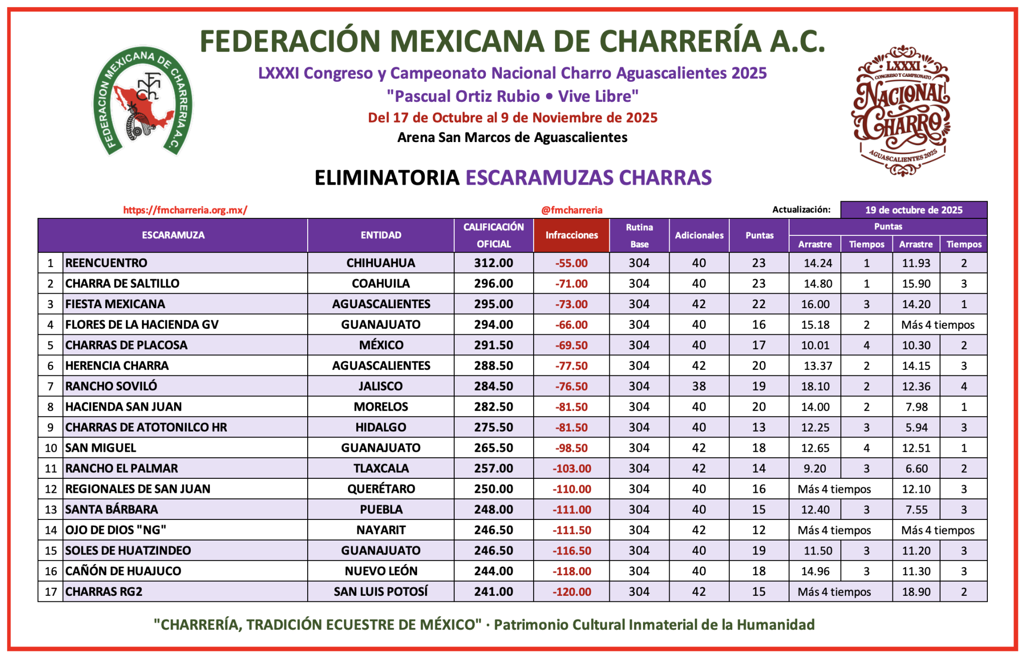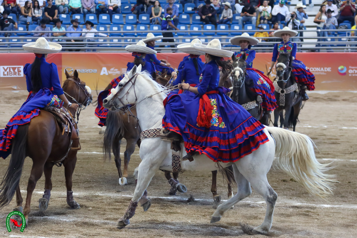 Por su parte, la escaramuza Herencia Charra de Aguascalientes también mantuvo el tipo en su presentación en la charreada vespertina, cosechando un promedio de 288.50 unidades, gracias a la labor de Ximena Berumen y Alondra Quezada Moreno, quienes cobraron 20 de las puntas; sus infracciones fueron 77.50 tantos, de una rutina con valor total de 346 buenos, y al momento ocupan la sexta plaza.