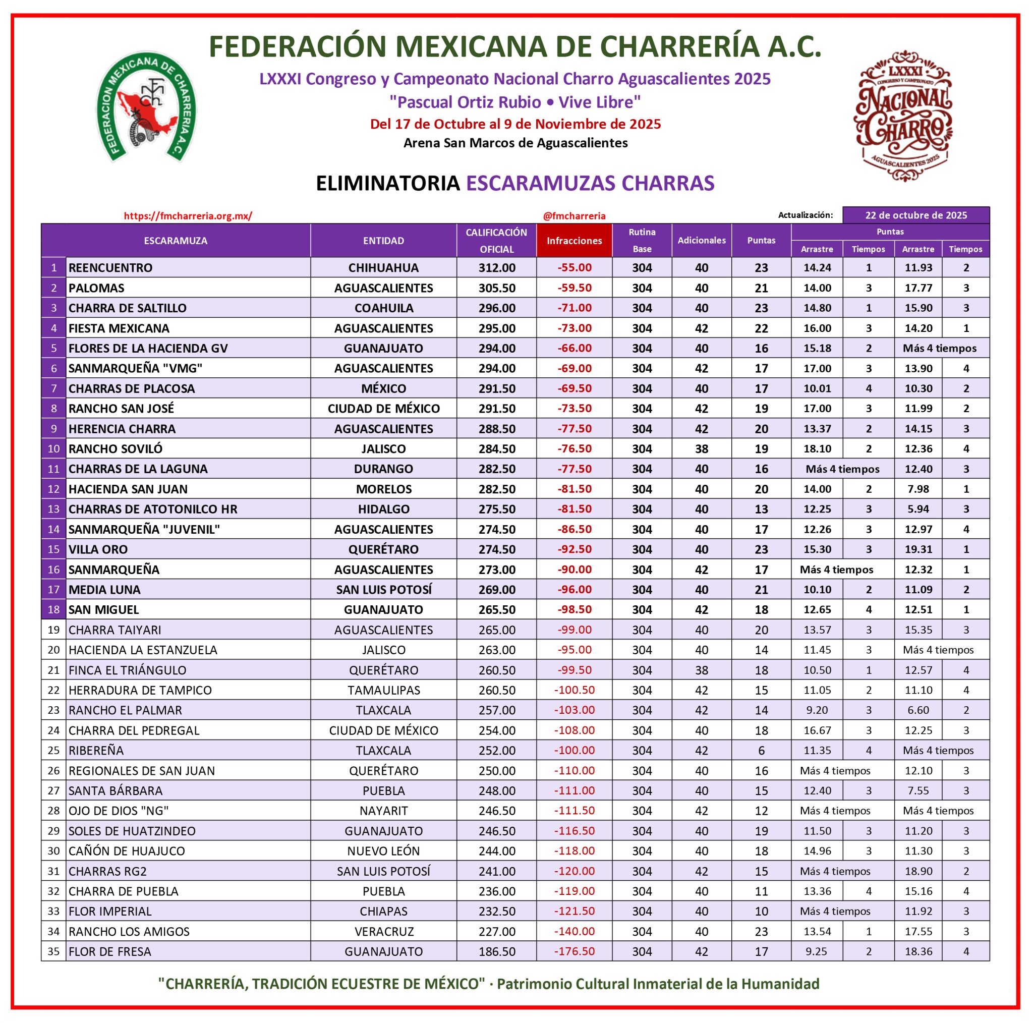 En esta charreada participó una escaramuza hidrocálida, Sanmarqueña, que fue monarca nacional en Lagos de Moreno 2003, aunque en esta ocasión no tuvo la mejor fortuna en la rutina, contabilizando 90 infracciones, y a pesar de los 17 logrados en puntas, las acaudilladas por Jazmín Muñoz de Lira concluyeron con 273.00 puntos, que les tiene en el puesto 16, al borde del abismo.
