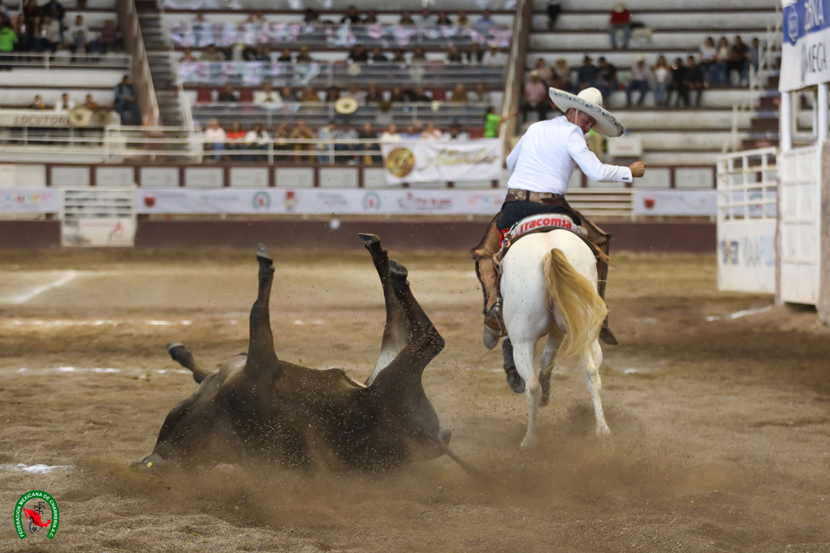 Destacó en su monta de toro Lorenzo Roel Hernández para obtener 17 buenos, lazo cabecero de 27 de Gustavo Gámez Hernández y 23 del pial de ruedo de Teodulfo Basurto Castellanos, con el ahorro de tres minutos.