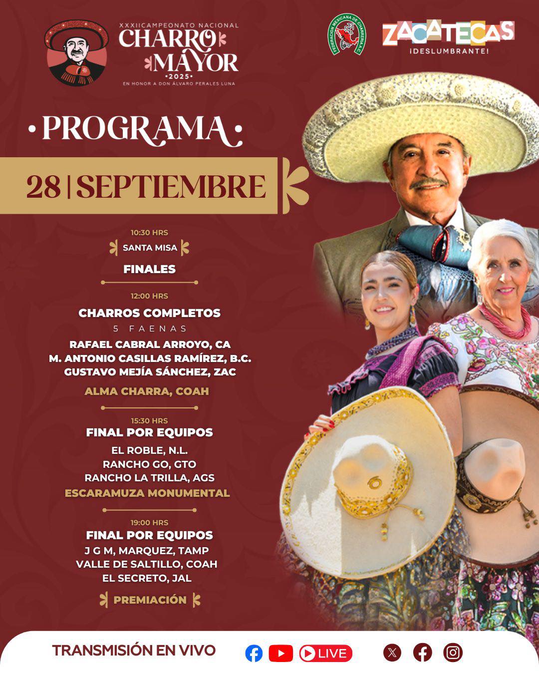 Con estos resultados, todo quedó listo para las finales de este domingo 28 de septiembre. A las 12:00 horas se disputará la Final de Charro Mayor en Cinco Faenas, con la participación de Rafael Cabral Arroyo de California, Marco Antonio Casillas Ramírez de Baja California y Gustavo Mejía Sánchez de Zacatecas, acompañados por la presentación especial de la escaramuza campeona Alma Charra de Coahuila.
