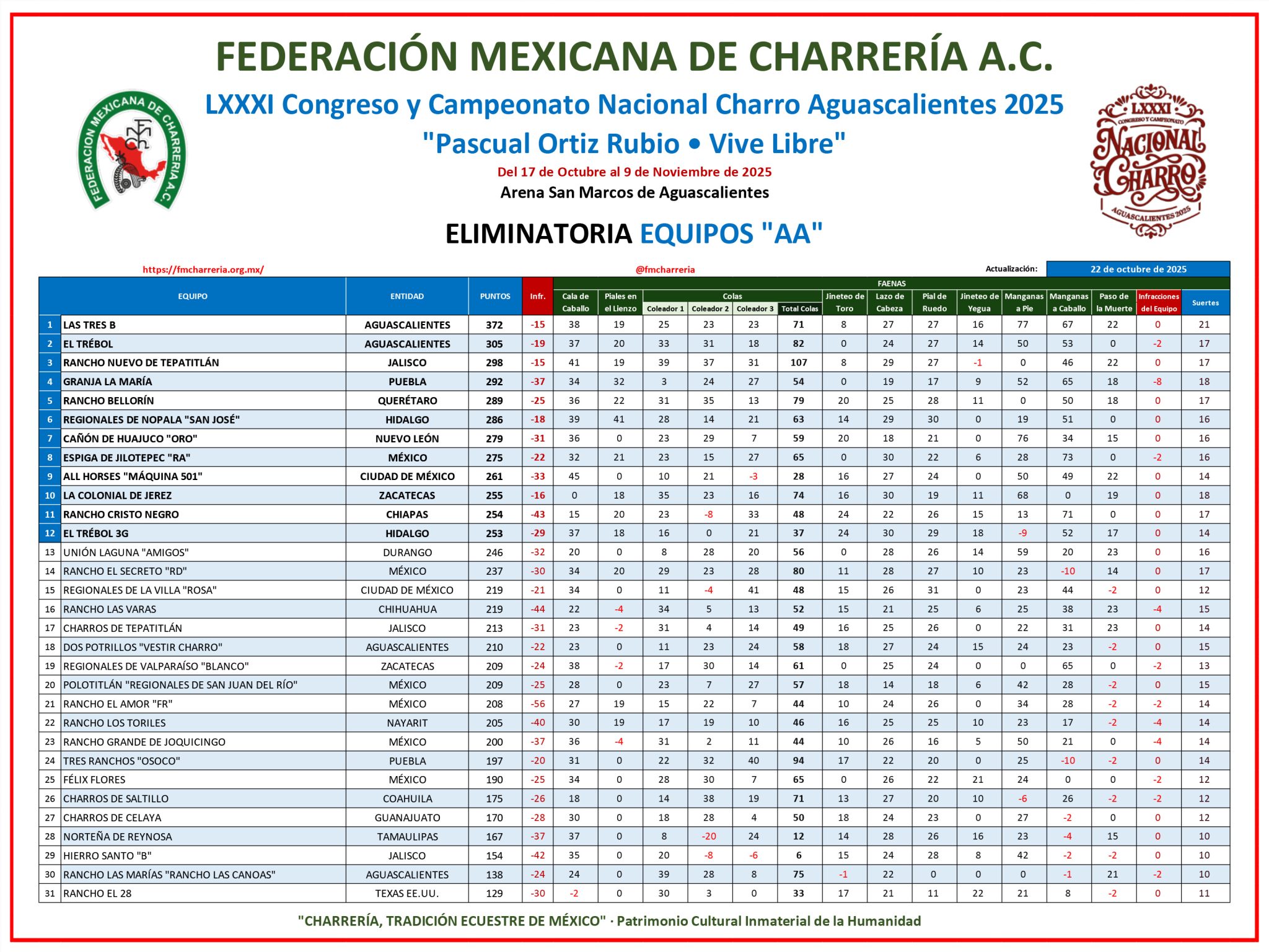 Los Regionales de Nopala “San José” de Hidalgo estuvieron a punto de cruzar el umbral de las tres centenas de unidades, faltándoles el paso de la muerte, por lo que su victoria a primera hora del miércoles, con 286 puntos, le ubica momentáneamente en la sexta posición de la categoría “AA” del LXXXI Congreso y Campeonato Nacional Charro Aguascalientes 2025 “Pascual Ortiz Rubio – Vive Libre”.
