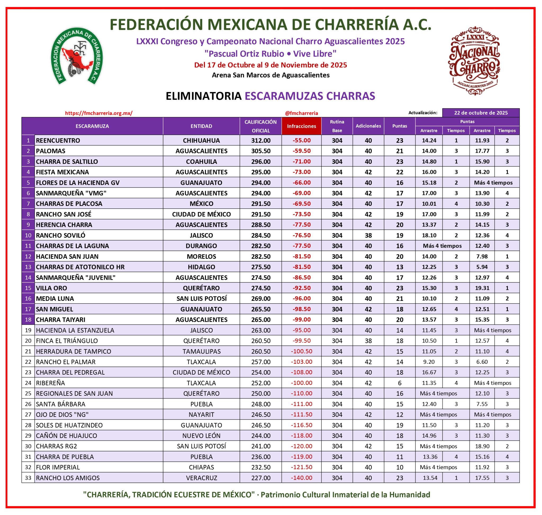 Por otra parte, la escaramuza Media Luna de Ríoverde, San Luis Potosí, se presentó con la música Amor de un rato, logrando 269.00 puntos finales, abriendo con las puntas de María José Guerrero Izar y Soledad Serrato Urbina, contabilizando 21 unidades; obteniendo los 304 de la suma base y 40 adicionales de ejercicios, ante 96 infracciones.